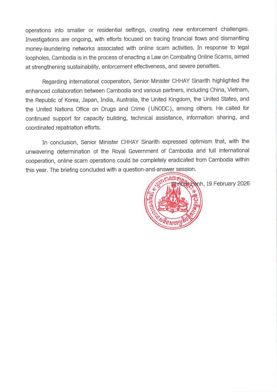 បន្ថែមពីនេះ លោក បានបញ្ជាក់ជាថ្មីនូវការប្តេជ្ញាចិត្តរបស់កម្ពុជាក្នុង ការលុបបំបាត់ប្រតិបត្តិការឆបោកតាមប្រព័ន្ធបច្ចេកវិទ្យា តាមរយៈការពង្រឹងការបង្ក្រាបនៅទូទាំងប្រទេស ក្រោមការដឹកនាំដោយផ្ទាល់របស់ សម្តេចធិបតីនាយករដ្ឋមន្ត្រី ហ៊ុន ម៉ាណែត ដែលជាប្រធានគណៈកម្មការប្រយុទ្ធប្រឆាំងនឹងការឆបោកតាមប្រព័ន្ធបច្ចេកវិទ្យា ដែលបានបង្កើតឡើងនៅដើមឆ្នាំមុន ដើម្បីធានានូវប្រសិទ្ធភាព នៃយុទ្ធនាការនេះ។
