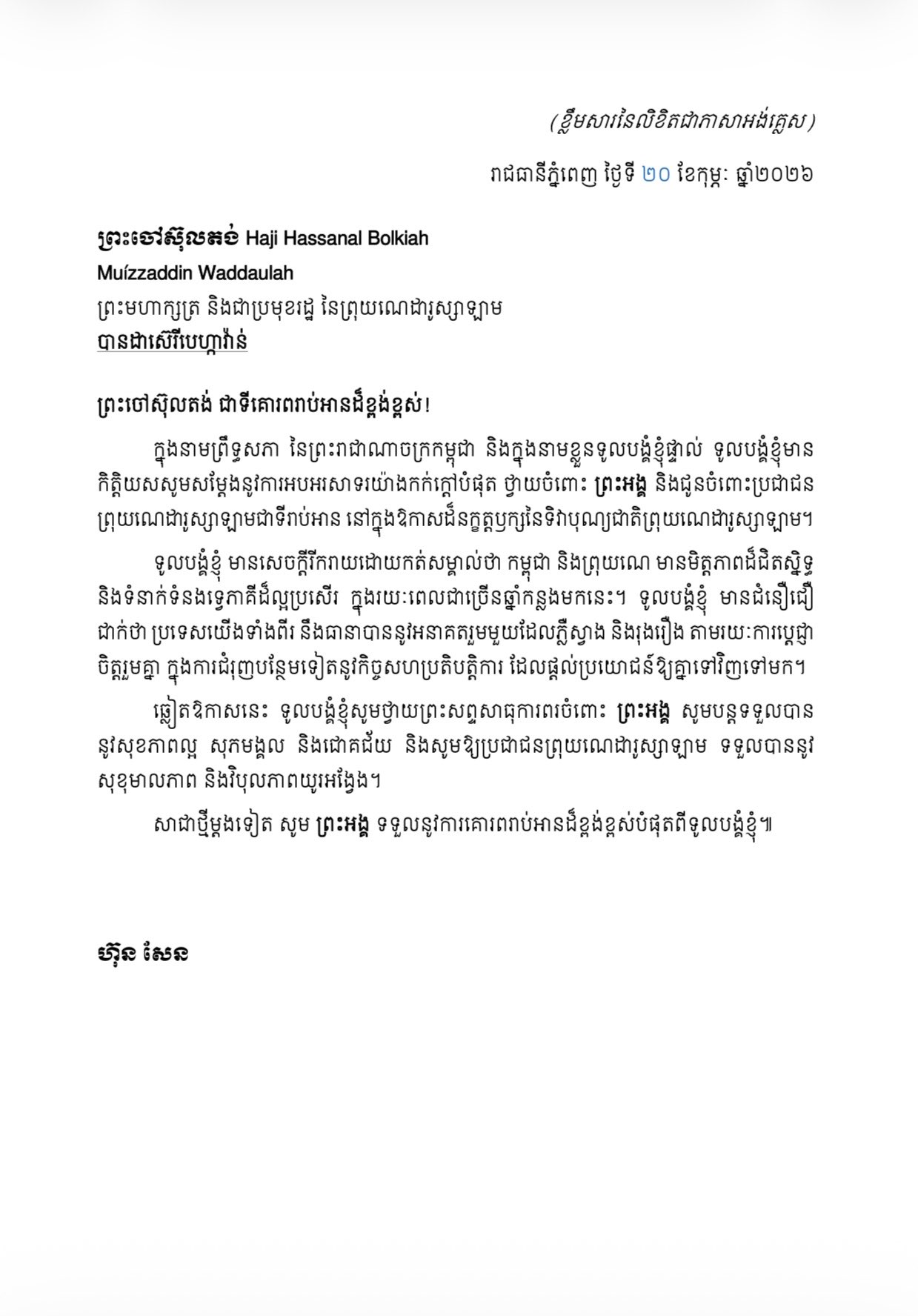 ឆ្លៀតឱកាសនេះ សម្ដេចតេជោ ហ៊ុន សែន សូមថ្វាយព្រះសព្ទសាធុការពរចំពោះ ព្រះអង្គ សូមបន្តទទួលបាន នូវសុខភាពល្អ សុភមង្គល និងជោគជ័យ និងសូមឱ្យប្រជាជនព្រុយណេដារូស្សាឡាម ទទួលបាននូវ សុខុមាលភាព និងវិបុលភាពយូរអង្វែង៕