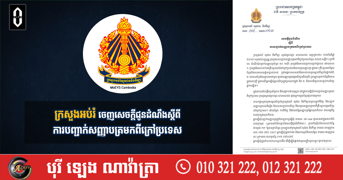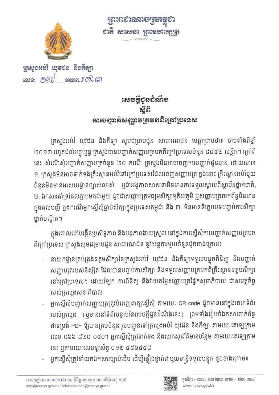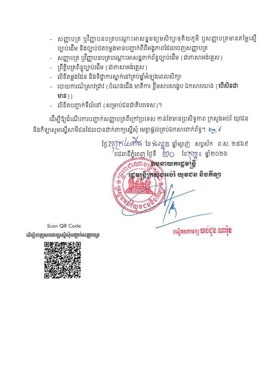 (ភ្នំពេញ)៖ ក្រសួងអប់រំ យុវជន និងកីឡា នៅថ្ងៃទី២០ ខែកុម្ភៈ ឆ្នាំ២០២៦នេះ បានចេញសេចក្តីជូនដំណឹង ស្តីពី ការបញ្ជាក់សញ្ញាបត្រមកពីក្រៅប្រទេស ។