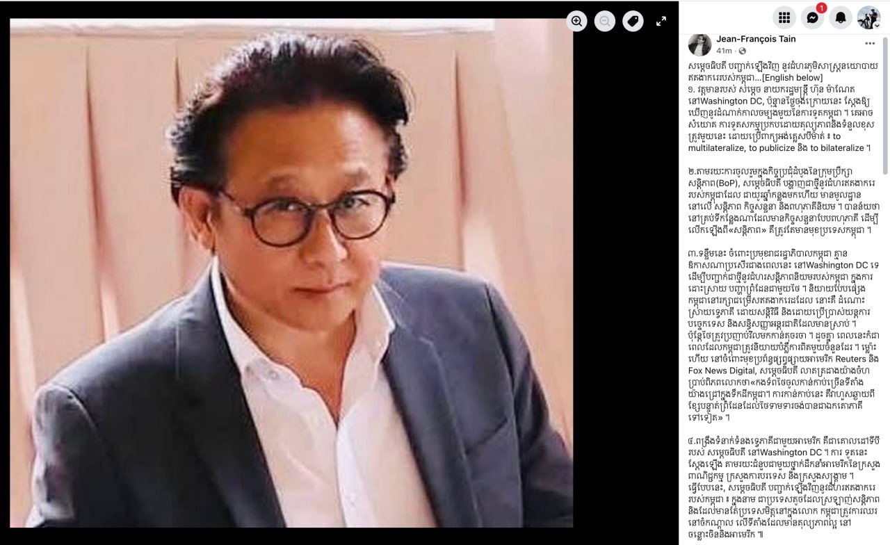 តាមរយៈបណ្តាញសង្គម លោក តាន់ ហ្សង់ហ្រ្វង់ស័រ បានរៀបរាប់យ៉ាងដូច្នេះថា៖ «សម្តេចធិបតី បញ្ជាក់ឡើងវិញនូវជំហរភូមិសាស្ត្រនយោបាយឥតងាករេរបស់កម្ពុជា រួមមាន៖