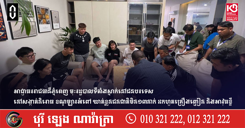 អាជ្ញាធររាជធានីភ្នំពេញ ចុះរដ្ឋបាលទីតាំងស្នាក់នៅជនបរទេស នៅសង្កាត់និរោធ ខណ្ឌច្បារអំពៅ ឃាត់ខ្លួនជនជាតិចិន១៣នាក់ ដកហូតគ្រឿងញៀន និងអាវុធខ្លី