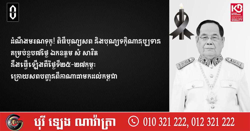 ដំណឹងមរណទុក្ខ! ពិធីបុណ្យសព និងបុណ្យទក្ខិណានុប្បទានគម្រប់ខួប៧ថ្ងៃ ឯកឧត្តម សំ សារិត នឹងធ្វើឡើងពីថ្ងៃទី២៥-២៧កុម្ភៈ ក្រោយសពបញ្ជូនពីកាណាដាមកដល់កម្ពុជា