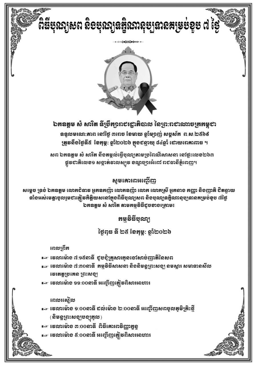 (ភ្នំពេញ)៖ ពិធីបុណ្យសព និងបុណ្យទក្ខិណានុប្បទានគម្រប់ខួប៧ថ្ងៃ របស់ឯកឧត្តម សំ សារិត ទីប្រឹក្សារាជរដ្ឋាភិបាល (ឪពុកបង្កើតលោកឧត្តមសេនីយ៍ត្រី សំ តុលា មេបញ្ជាការអាវុធហត្ថខេត្តកណ្តាល) ដែលបានទទួលមរណភាព ដោយរោគាពាធ ក្នុងជន្មាយុ៨៤ឆ្នាំ នឹងធ្វើឡើងពីថ្ងៃទី២៥-២៧កុម្ភៈ ឆ្នាំ២០២៦ ក្រោយពីសពរបស់ឯកឧត្តមបានបញ្ជូនពីប្រទេសកាណាដា មកដល់កម្ពុជា។
