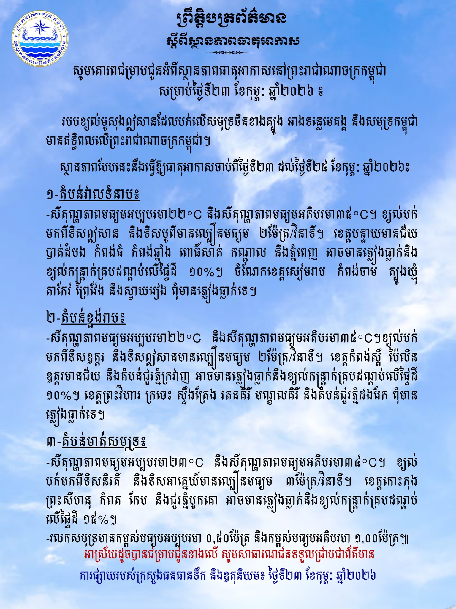 ក្រសួងធនធានទឹក ជូនដំណឹងអំពីស្ថានភាពធាតុអាកាសនៅកម្ពុជា សម្រាប់ថ្ងៃទី២៣ ខែកុម្ភៈ ឆ្នាំ២០២៦