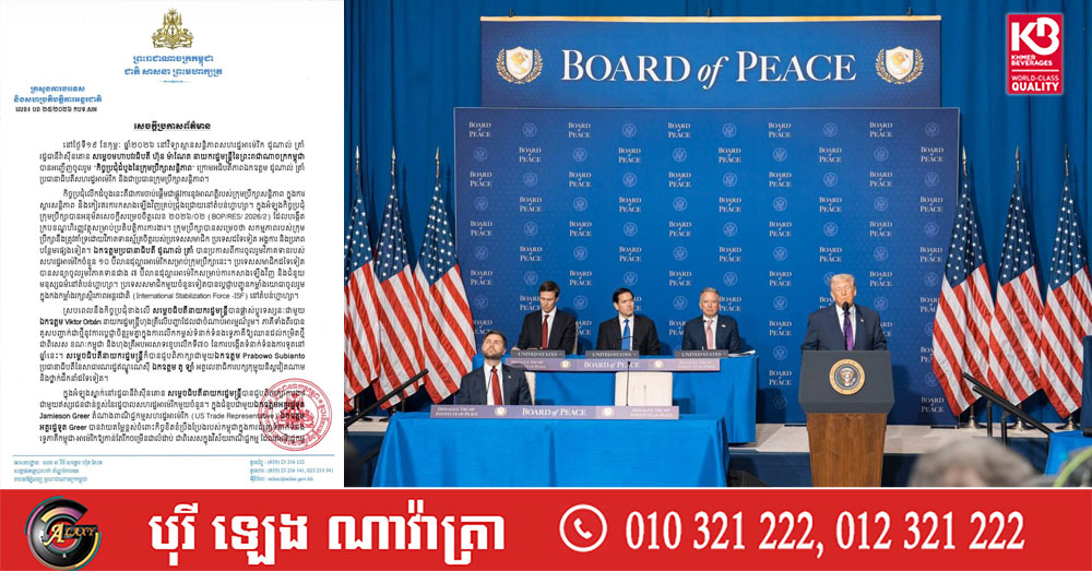 សូមជម្រាបថា លោកប្រធានាធិបតីអាម៉េរិក ដូណាល់ ត្រាំ បានផ្ញើលិខិតជូនសម្តេចនាយករដ្ឋមន្ត្រី ហ៊ុន ម៉ាណែត ដើម្បីអញ្ជើញកម្ពុជាចូលរួមជារដ្ឋស្ថាបនិកនៃក្រុមប្រឹក្សាសន្តិភាព និងជាភាគីនៃធម្មនុញ្ញរបស់ក្រុមប្រឹក្សាសន្តិភាព។ ក្នុងលិខិតចុះថ្ងៃទី១៦ ខែមករា លោក ត្រាំ បញ្ជាក់ថា នេះជាគំនិតផ្តួចផ្តើមប្រវត្តិសាស្ត្រមួយក្នុងការបង្កើតសន្តិភាពនៅតំបន់មជ្ឈិមបូព៌ា និងឈានដល់ការដោះស្រាយជម្លោះជាសកល។