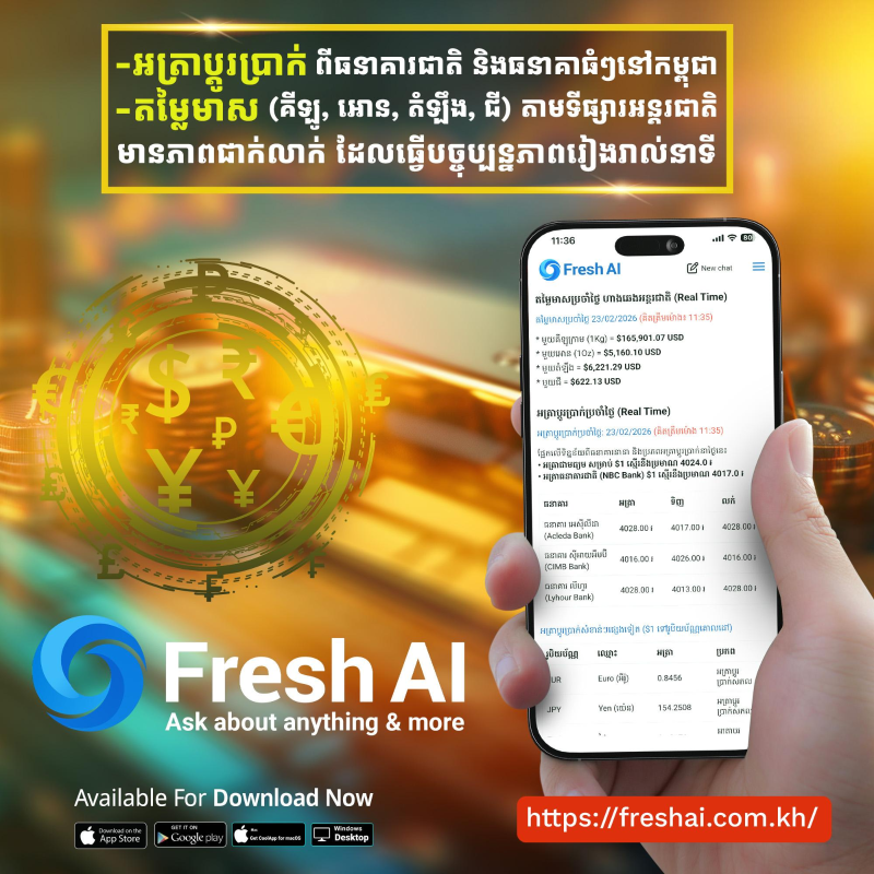 (ភ្នំពេញ)៖ នៅក្នុងពិភពហិរញ្ញវត្ថុដែលមានការប្រែប្រួលយ៉ាងរហ័ស ការទទួលបានព័ត៌មានទាន់ហេតុការណ៍គឺជាគន្លឹះនៃជោគជ័យ។ កម្មវិធី Fresh AI បានដាក់ឱ្យប្រើប្រាស់នូវប៊ូតុងមុខងារថ្មី «Gold & Exchange» ដែលជាមុខងារដ៏មានសារៈសំខាន់បំផុតសម្រាប់អ្នកវិនិយោគ និងអាជីវករនៅក្នុងប្រទេសកម្ពុជា ជាពិសសសម្រាប់អ្នកតាមដាន «តម្លៃមាស និងដុល្លារ»។
