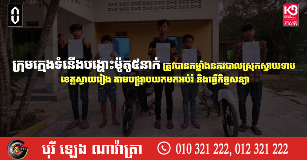 ក្រុមក្មេងទំនើងបង្ហោះម៉ូតូ៥នាក់ ត្រូវបានកម្លាំងនគរបាលស្រុកស្វាយទាប ខេត្តស្វាយរៀង តាមបង្រ្កាបយកមកអប់រំ និងធ្វើកិច្ចសន្យា