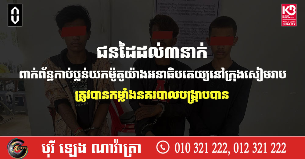 ជនដៃដល់៣នាក់ ពាក់ព័ន្ធកាប់ប្លន់យកម៉ូតូយ៉ាងអនាធិបតេយ្យនៅក្រុងសៀមរាប ត្រូវបានកម្លាំងនគរបាលបង្ក្រាបបាន