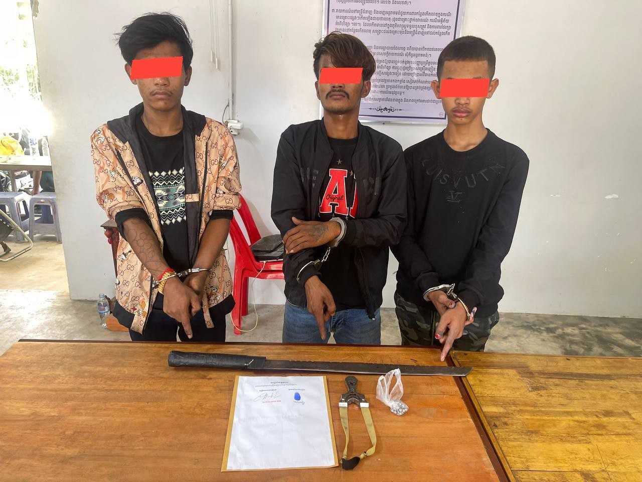 វត្ថុតាងដកហូត៖ ដាវកែច្នៃ (ផ្លែដែកដងដែករុំស្កុតពណ៌ខ្មៅ) ចំនួន ១ដើម, ម្សៅក្រាមពណ៌ស (ប្រភេទគ្រឿងញៀន) ចំនួន ១កញ្ចប់តូច, ជំពាមកៅស៊ូ ចំនួន១ និងគ្រាប់កង់ចំនួន ២៨គ្រាប់ ទូរស័ព្ទដៃចំនួន ៣គ្រឿង និងម៉ូតូ Honda Dream ពណ៌ខ្មៅ ពុំមានផ្លាកលេខ ចំនួន ២គ្រឿង។ ក្រោយធ្វើតេស្តរកសារធាតុញៀន មុខសញ្ញាទាំង៣នាក់ វិជ្ជមាន។