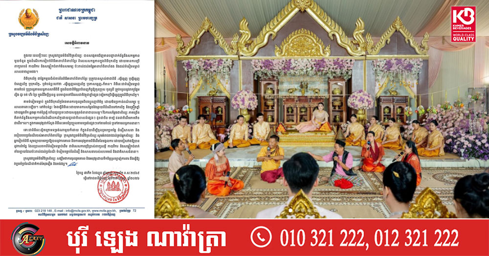 (ភ្នំពេញ)៖ តាមរយៈសេចក្តីអំពាវនាវរបស់ខ្លួន នៅថ្ងៃទី២៣ ខែកុម្ភៈ ឆ្នាំ២០២៦នេះ ក្រសួងវប្បធម៌ និងវិចិត្រសិល្បៈ បានអំពាវនាវដល់គ្រប់អ្នកសិល្បៈ និងអ្នករៀបចំពិធី សូមព្យាយាមរក្សាឱ្យបាននូវការគោរព និងការអនុវត្តតាមពិធីដើមនៃមង្គលការ ដោយចៀសវាងឱ្យបាននូវការកែច្នៃ ដែលប្រាសចាកពីទំនៀមទម្លាប់ដើម ជាពិសេសការប្រើប្រាស់ពាក្យសម្តី កាយវិកា និងសម្លៀកបំពាក់ទាំងឡាយ ដែលប៉ះពាល់ដល់ប្រពៃណី ទំនៀមទម្លាប់នៃជំនឿ និងសាសនារបស់សហគមន៍ និងជាតិសាសន៍នានា។