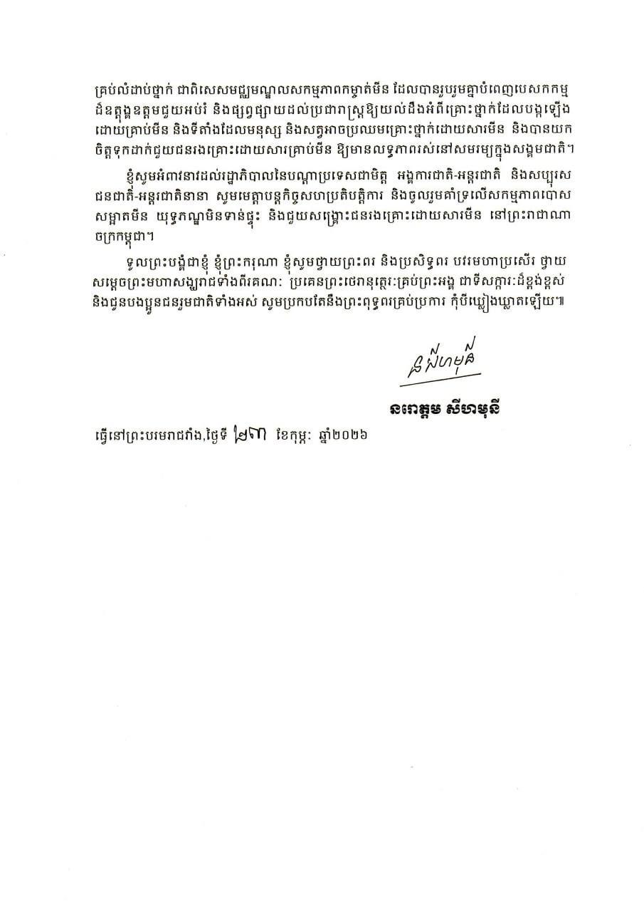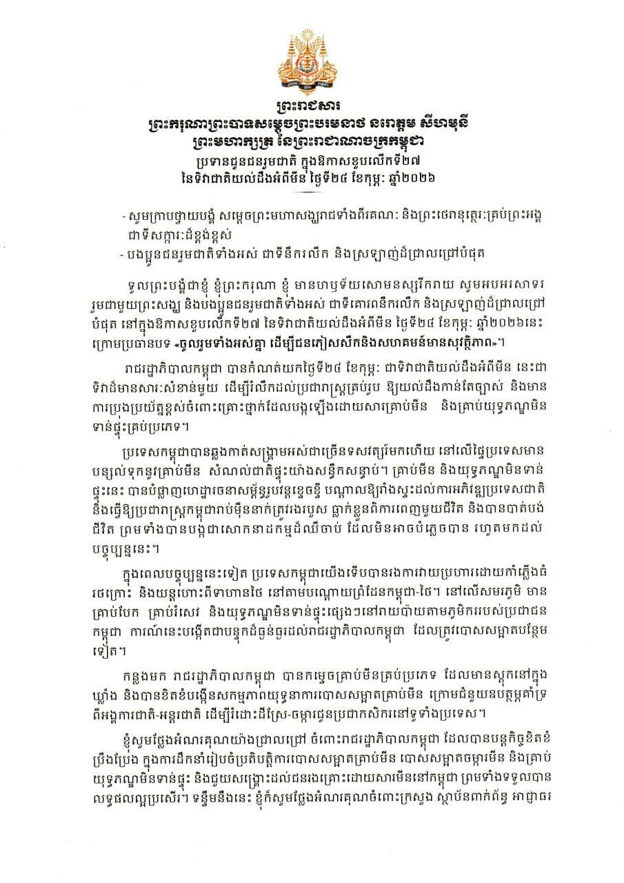 (ភ្នំពេញ)៖ ព្រះករុណា ព្រះបាទ សម្តេចព្រះ បរមនាថ នរោត្តម សីហមុនី ព្រះមហាក្សត្រកម្ពុជា បានផ្ញើព្រះរាជសារអបអរសាទរ ក្នុងឱកាសខួបលើកទី២៧ នៃទិវាជាតិយល់ដឹងអំពីមីន ថ្ងៃទី២៤ ខែកុម្ភៈ ឆ្នាំ២០២៦នេះ ក្រោមប្រធានបទ «ចូលរួមទាំងអស់គ្នា ដើម្បីជនភៀសសឹកនិងសហគមន៍មានសុវត្ថិភាព»។