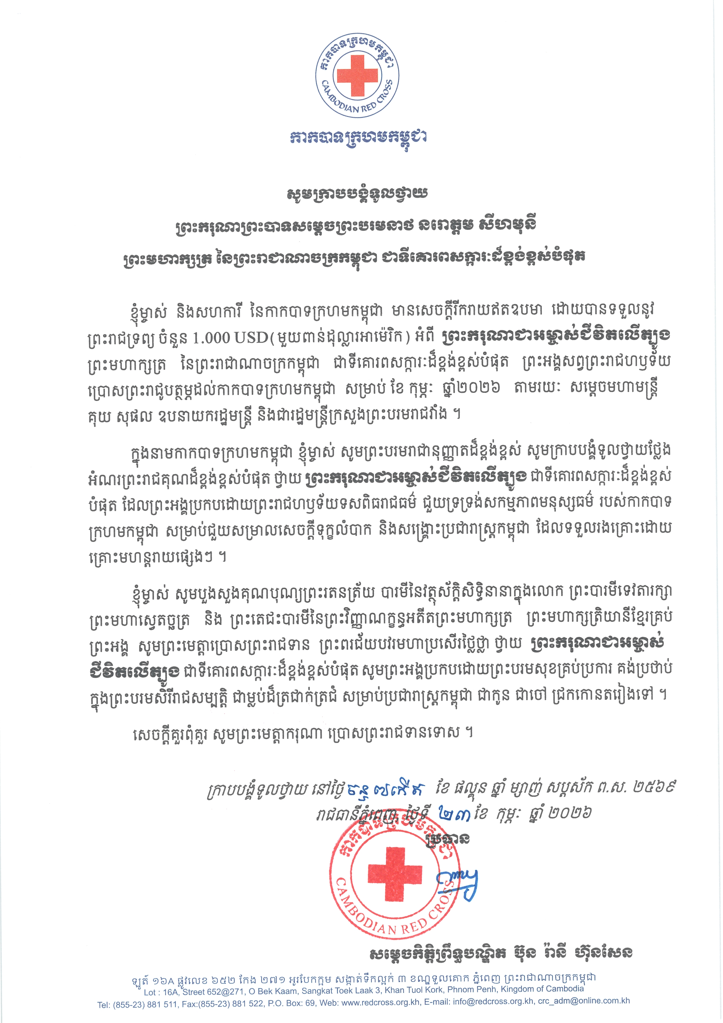 ក្នុងសារលិខិតនោះមានខ្លឹមសារថា ៖ «ខ្ញុំម្ចាស់ និងសហការី នៃកាកបាទក្រហមកម្ពុជា មានសេចក្តីរីករាយឥតឧបមា ដោយបានទទួលនូវព្រះរាជទ្រព្យ ចំនួន 1,000 USD (មួយពាន់ដុល្លារអាម៉េរិក) អំពី ព្រះករុណាជាអម្ចាស់ជីវិតលើត្បូង ព្រះមហាក្សត្រ នៃព្រះរាជាណាចក្រកម្ពុជា ជាទីគោរពសក្ការៈដ៏ខ្ពង់ខ្ពស់បំផុត ព្រះអង្គសព្វព្រះរាជហឫទ័យ ប្រោសព្រះរាជូបត្ថម្ភដល់កាកបាទក្រហមកម្ពុជា សម្រាប់ខែមករា ឆ្នាំ២០២៦ តាមរយៈ សម្តេចមហាមន្ត្រី គុយ សុផល ឧបនាយករដ្ឋមន្ត្រី និងជារដ្ឋមន្ត្រីក្រសួងព្រះបរមរាជវាំង។