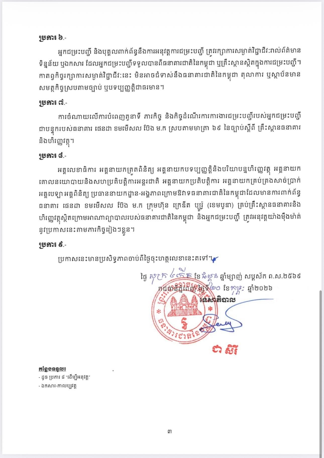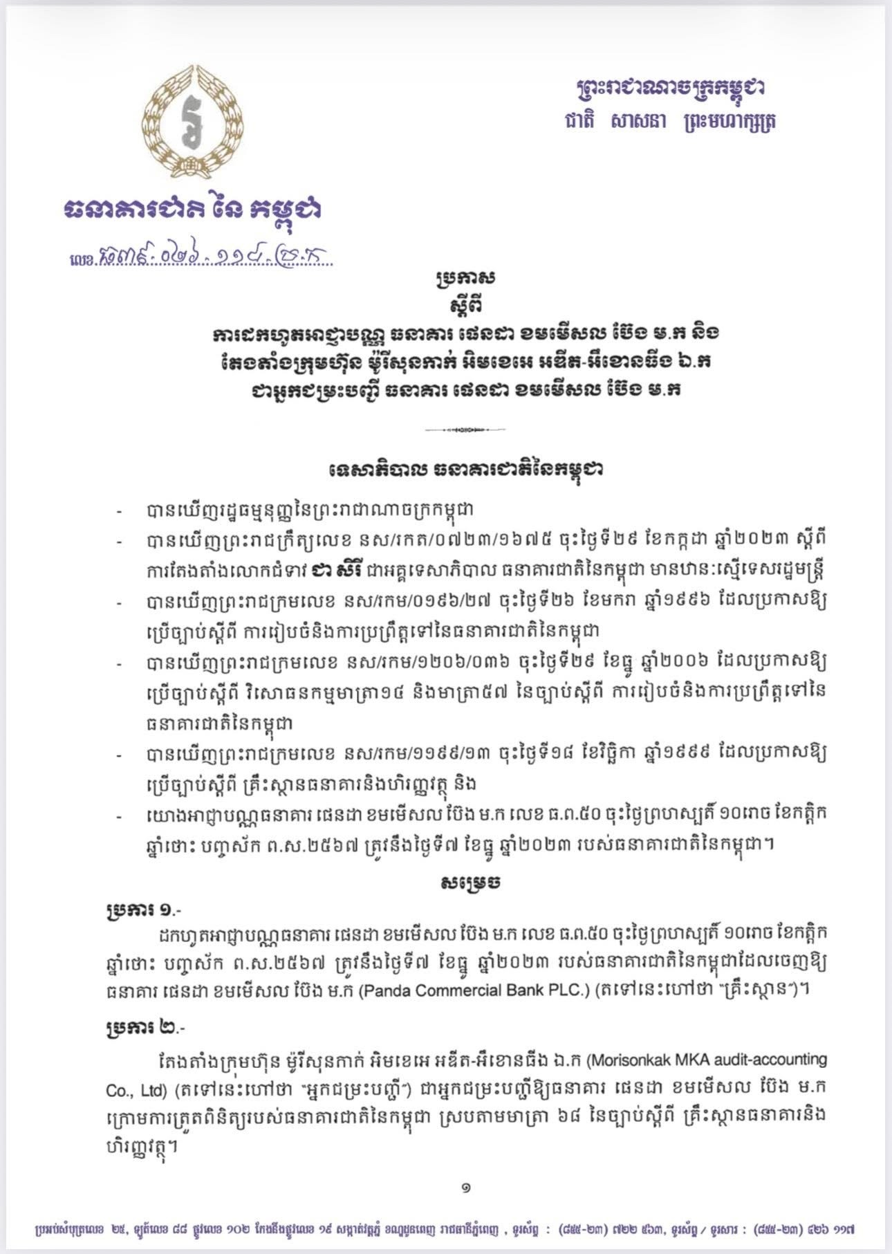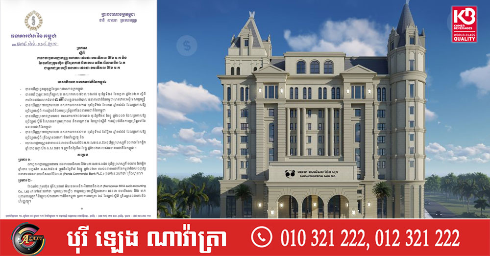(ភ្នំពេញ)៖ ធនាគារជាតិនៃកម្ពុជា បានសម្រេចដកហូតអាជ្ញាបណ្ណធនាគារផេនដា ខមមើសលប៊ែង ម.ក លែងឱ្យប្រតិបត្តិការអាជីវកម្មទៀតហើយ។ ការសម្រេចបានធ្វើឡើងតាមរយៈសេចក្តីប្រកាសកាលពីថ្ងៃទី២០ ខែកុម្ភៈ ឆ្នាំ២០២៦កន្លងទៅនេះ។