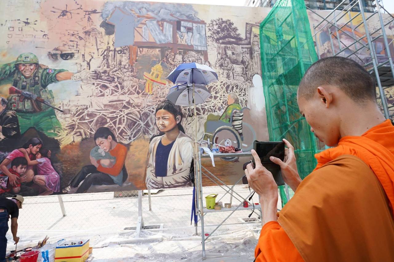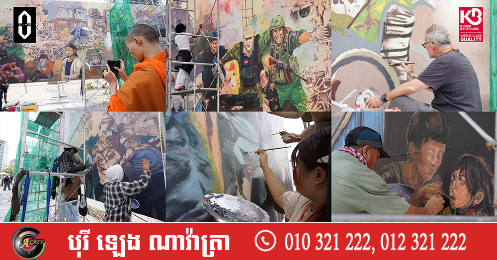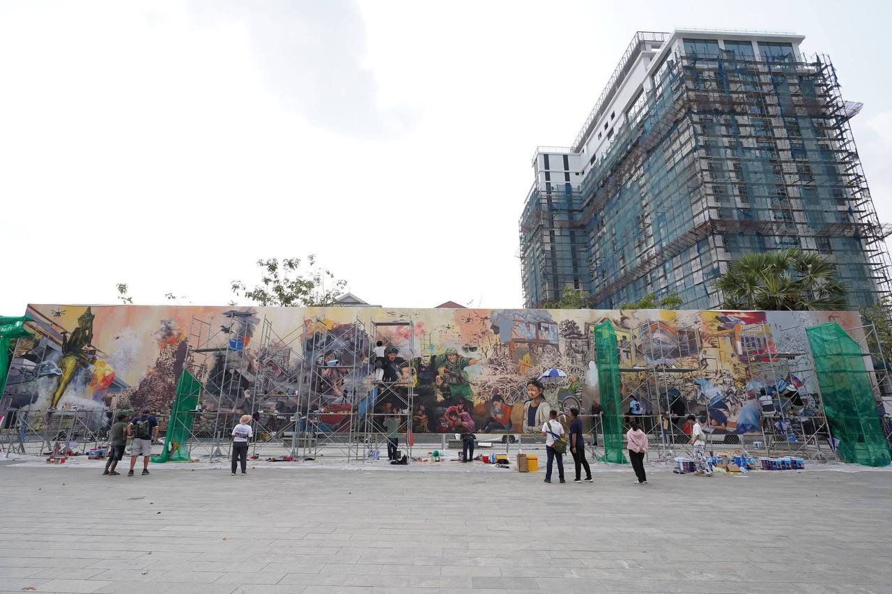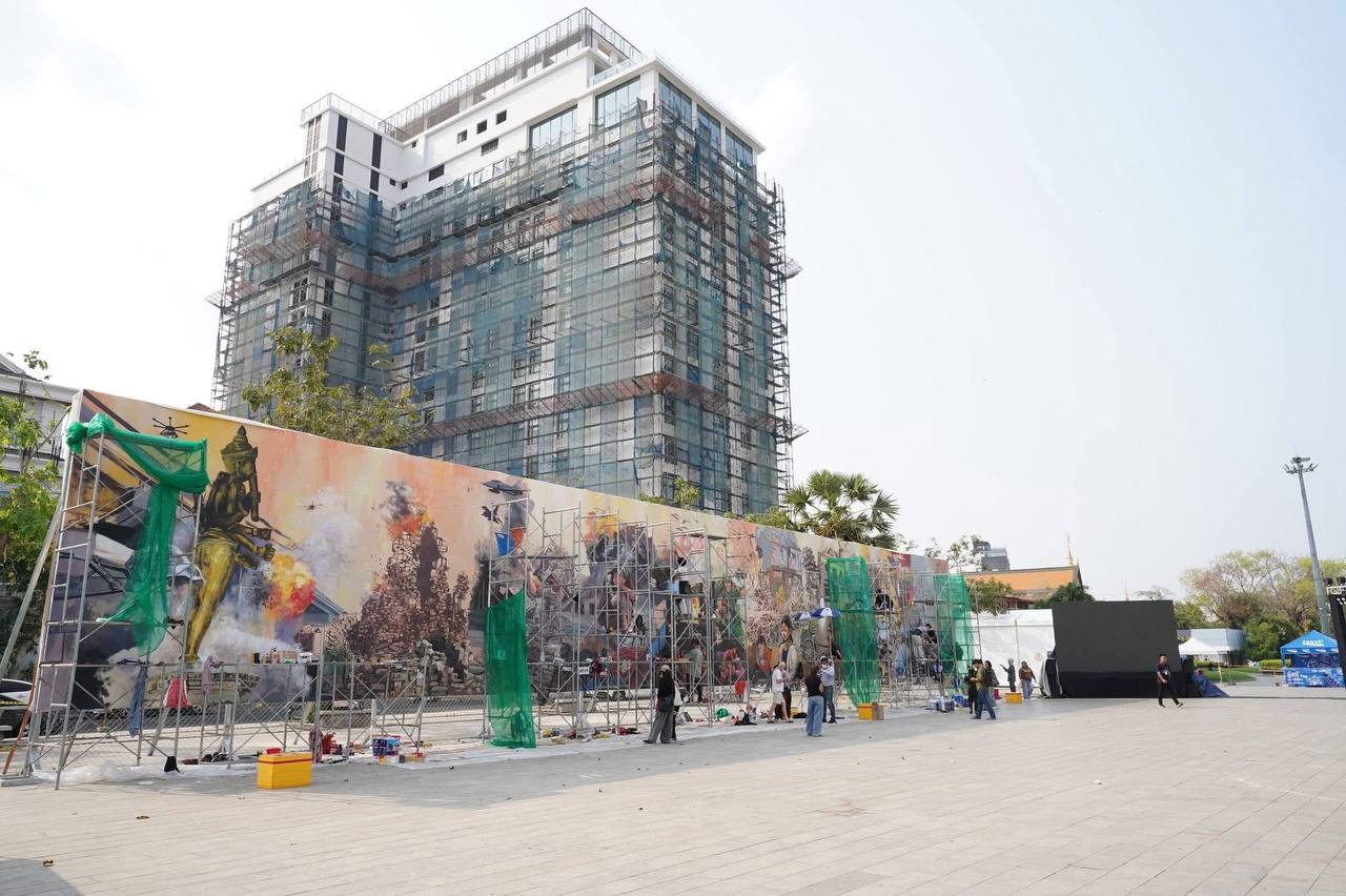 (ភ្នំពេញ)៖ ក្រុមវិចិត្រករជាច្រើនរូប កំពុងមមាញឹកក្នុងការគូរផ្ទាំងគំនូរក្រោមប្រធានបទ «សិល្បៈដើម្បីសន្តិភាព» ដែលបានចាប់ផ្តើមតាំងពីថ្ងៃទី២០ ខែកុម្ភៈ ឆ្នាំ២០២៦មកហើយ នៅបរិវេណមុខវត្តបទុមវតី រាជធានីភ្នំពេញ។ ផ្ទាំងគំនូរដ៏ធំនេះ មានទំហំ ៥ម៉ែត្រ គុណនឹង ៣៥ម៉ែត្រ និងគ្រោងចំណាយពេលសរុបប្រមាណ១០ថ្ងៃ ដើម្បីបញ្ចប់ការគូរ។