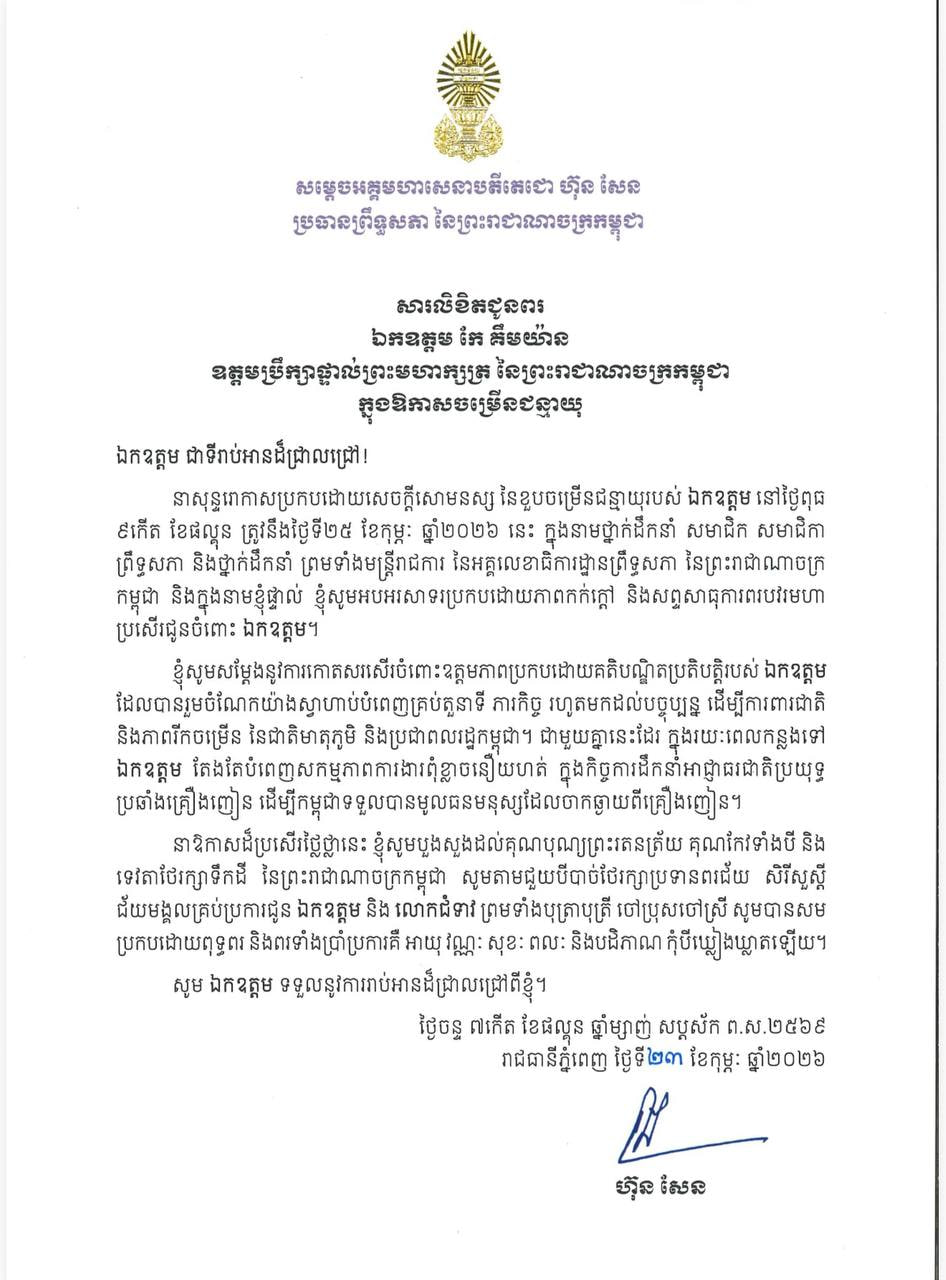 ក្នុងសារលិខិតជូនពរ របស់សម្ដេចតេជោ ហ៊ុន សែន បានសរសេរថា «នាសុន្ទរោកាសប្រកបដោយសេចក្តីសោមនស្ស នៃខួបចម្រើនជន្មាយុរបស់ ឯកឧត្តម នៅថ្ងៃពុធ ៩កើត ខែផល្គុន ត្រូវនឹងថ្ងៃទី២៥ ខែកុម្ភៈ ឆ្នាំ២០២៦នេះ ក្នុងនាមថ្នាក់ដឹកនាំ សមាជិក សមាជិកា ព្រឹទ្ធសភា និងថ្នាក់ដឹកនាំ ព្រមទាំងមន្ត្រីរាជការ នៃអគ្គលេខាធិការដ្ឋានព្រឹទ្ធសភា នៃព្រះរាជាណាចក្រ កម្ពុជា និងក្នុងនាមខ្ញុំផ្ទាល់ ខ្ញុំសូមអបអរសាទរប្រកបដោយភាពកក់ក្តៅ និងសព្ទសាធុការពរបវរមហាប្រសើរជូនចំពោះ ឯកឧត្តម។