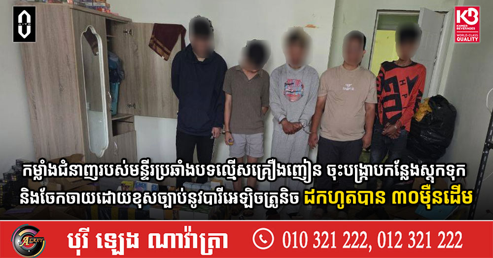(ភ្នំពេញ)៖ កម្លាំងជំនាញរបស់មន្ទីរប្រឆាំងបទល្មើសគ្រឿងញៀន ដោយមានការសម្របសម្រួលពីព្រះរាជអាជ្ញារងនៃអយ្យការអមសាលាដំបូងរាជធានីភ្នំពេញ ដឹកនាំដោយលោក សេង ម៉េងស្រ៊ុន បានចុះបង្រ្កាបករណីស្តុកទុក និងចែកចាយ ដោយខុសច្បាប់នូវបារីអេឡិចត្រូនិច ស្ថិតនៅគោលដៅ ផ្ទះC5 ផ្លូវបេតុង ភូមិស្រុកចេក សង្កាត់ជើងឯក ខណ្ឌដង្កោ រាជធានីភ្នំពេញ ឃាត់ខ្លួនបានមនុស្ស ៥នាក់ វត្ថុតាង ចាប់បារីអេឡិចត្រូនិច ប្រមាណ ៣០០,០០០ដើម។