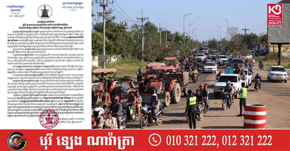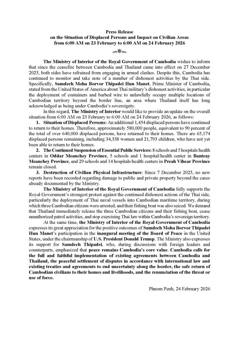 (ភ្នំពេញ)៖ ក្រសួងមហាផ្ទៃ នៅថ្ងៃទី២៤ ខែកុម្ភៈ ឆ្នាំ២០២៦នេះ បានឲ្យដឹងថា គិតចាប់ពីម៉ោង៦ព្រឹក ថ្ងៃទី២៣ ដល់ម៉ោង៦ព្រឹក ថ្ងៃទី២៤ ខែកុម្ភៈ ឆ្នាំ២០២៦នេះ មានប្រជាពលរដ្ឋភៀសសឹក ១ ៤៥៤នាក់បន្ថែមទៀត បានវិលត្រឡប់ទៅលំនៅឋានវិញ។ ដូច្នេះក្នុងចំណោមពលរដ្ឋភៀសសឹកសរុបជាង៦សែន ៤ម៉ឺននាក់ មានជាង ៥សែន ៨ម៉ឺននាក់ ស្មើនឹងជាង ៩០ភាគរយ បានវិលត្រឡប់ទៅលំនៅឋានវិញ។