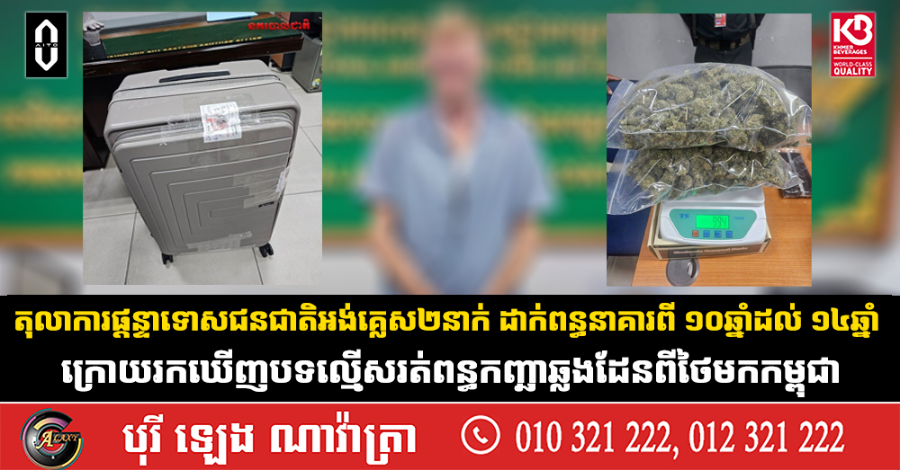 តុលាការផ្តន្ទាទោសជនជាតិអង់គ្លេស២នាក់ ដាក់ពន្ធនាគារពី ១០ឆ្នាំដល់ ១៤ឆ្នាំ ក្រោយរកឃើញបទល្មើសរត់ពន្ធកញ្ឆាឆ្លងដែនពីថៃមកកម្ពុជា