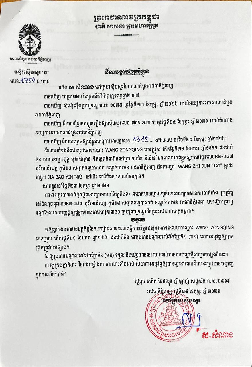 (ភ្នំពេញ)៖ លោក ស សំណាងស៊ើបសួរ នៃសាលាដំបូងរាជធានីភ្នំពេញ កាលពីថ្ងៃទី២៧ ខែកុម្ភៈ ឆ្នាំ២០២៦ បានចេញដីកាចំនួន២ផ្សេងគ្នាបង្គាប់ឱ្យឃុំខ្លួនបុរសជនជាតិចិនចំនួន២នាក់ ពាក់ព័ន្ធនឹងបទល្មើសឆបោកមានស្ថានទម្ងន់ទោស ជាក្រុមមានការចាត់តាំងប្រព្រឹត្តនៅក្នុងរាជធានីភ្នំពេញ។