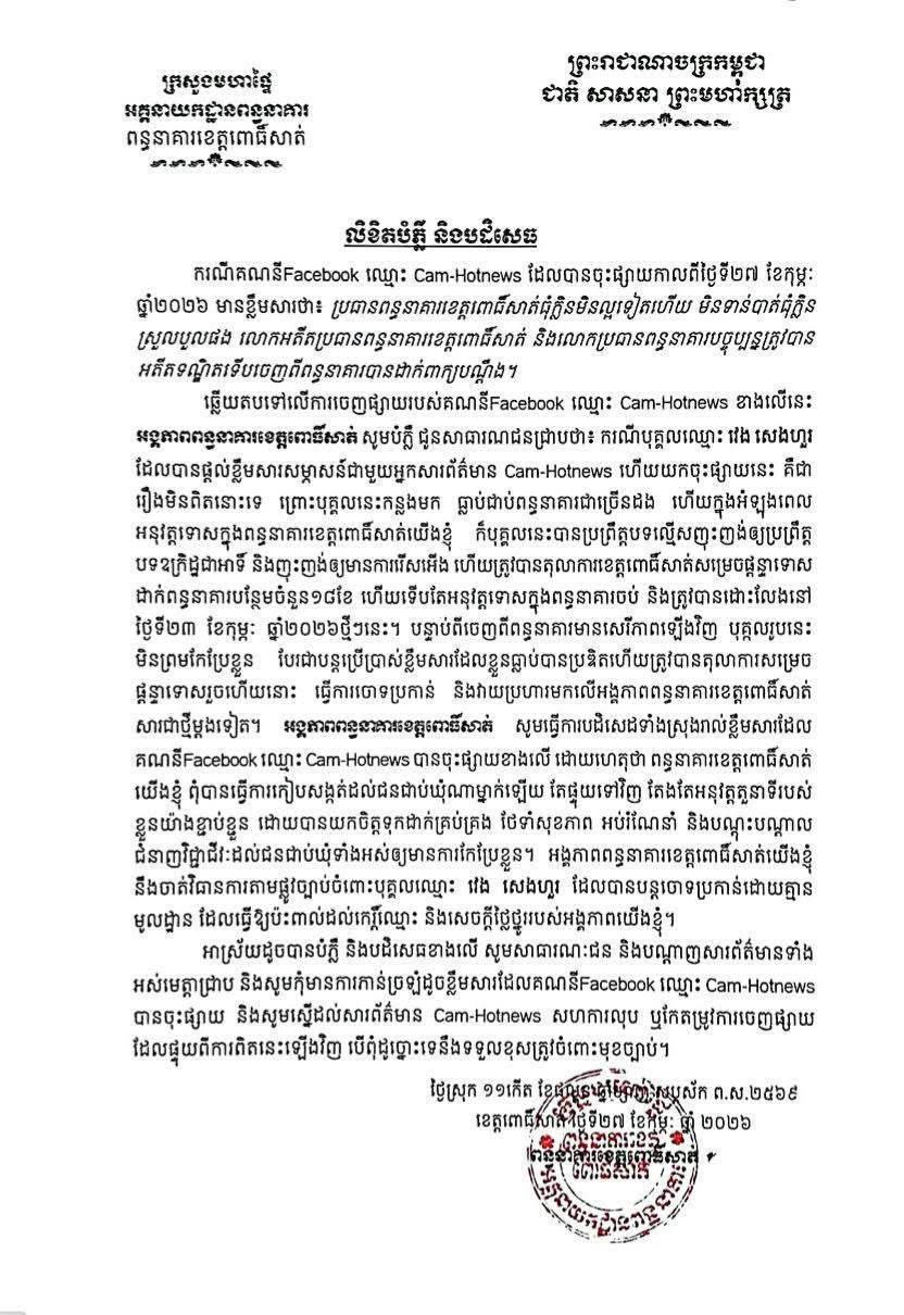 «ករណីបុគ្គលឈ្មោះ វេង សេងហួរ ដែលបានផ្តល់ខ្លឹមសារសម្ភាសជាមួយអ្នកសារព័ត៌មាន Cam-Hotnews ហើយយកចុះផ្សាយនេះ គឺជារឿងមិនពិតនោះទេ ព្រោះបុគ្គលនេះកន្លងមក ធ្លាប់ជាប់ពន្ធនាគារជាច្រើនដង ហើយក្នុងអំឡុងពេលអនុវត្តទោស ក្នុងពន្ធនាគារខេត្តពោធិ៍សាត់យើងខ្ញុំ ក៏បុគ្គលនេះបានប្រព្រឹត្តបទល្មើសញុះញង់ឲ្យប្រព្រឹត្តបទឧក្រិដ្ឋជាអាទិ៍ និងញុះញង់ឲ្យមានការរើសអើង ហើយត្រូវបានតុលាការខេត្តពោធិ៍សាត់សម្រេចផ្តន្ទាទោស ដាក់ពន្ធនាគារបន្ថែម ចំនួន១៨ខែ ហើយទើបតែអនុវត្តទោសក្នុងពន្ធនាគារចប់ និងត្រូវបានដោះលែង នៅថ្ងៃទី២៣ ខែកុម្ភៈ ឆ្នាំ២០២៦ថ្មីៗនេះ។