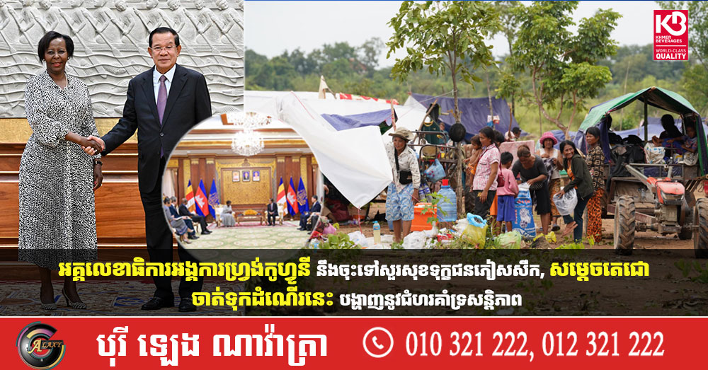 សម្តេចតេជោ ហ៊ុន សែន បានថ្លែងអំណរគុណចំពោះការចាប់អារម្មណ៍របស់លោកស្រីអគ្គលេខាធិការ ជាពិសេសការគ្រោងទៅសួរសុខទុក្ខជនភៀសសឹករបស់កម្ពុជា។ សម្តេចតេជោ ចាត់ទុកដំណើរទៅសួរសុខទុក្ខជនភៀសសឹក ជាការបង្ហាញច្បាស់នូវជំហររបស់លោកស្រីអគ្គលេខាធិការគាំទ្រដល់សន្តិភាព ហើយមិនចង់ឃើញការកើតឡើងនូវភ្លើងសង្គ្រាម។