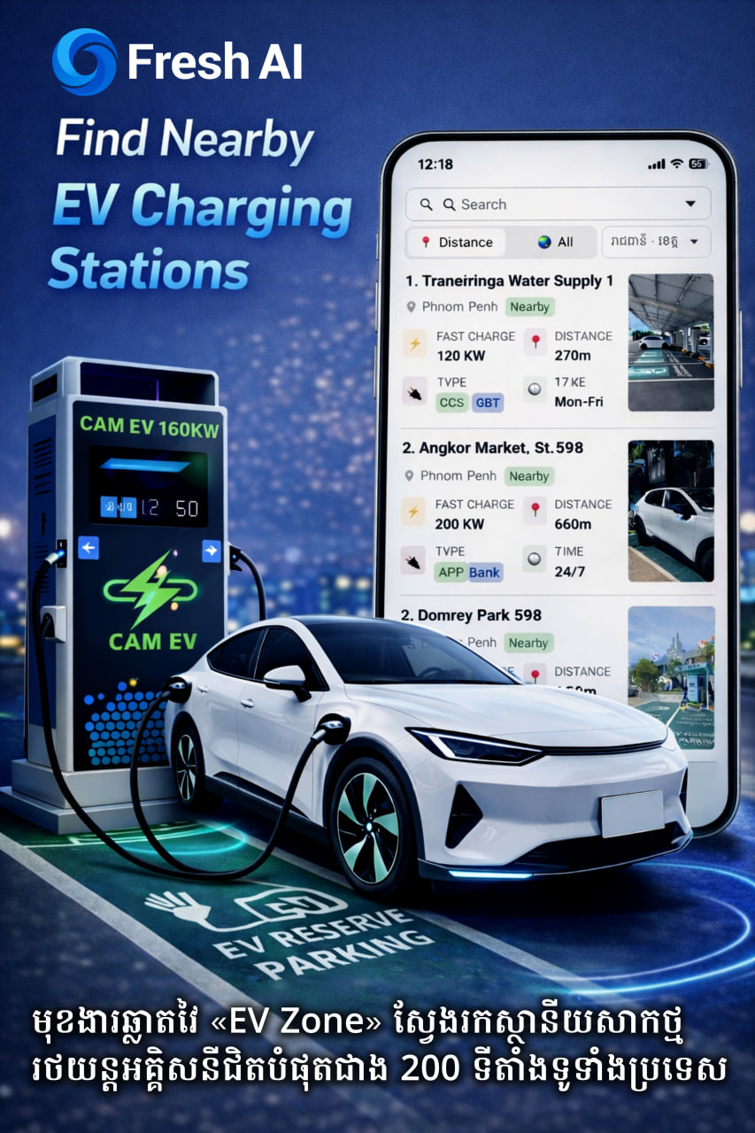 (ភ្នំពេញ)៖ ខណៈការប្រើប្រាស់រថយន្តអគ្គិសនី (EV) កំពុងកើនឡើងយ៉ាងឆាប់រហ័សនៅកម្ពុជា កម្មវិធី Fresh AI បានដាក់ឲ្យប្រើប្រាស់មុខងារវៃឆ្លាតថ្មីឈ្មោះ «EV Zone» ដើម្បីឆ្លើយតបទៅនឹងតម្រូវការរបស់អ្នកបើកបររថយន្តអគ្គិសនី។