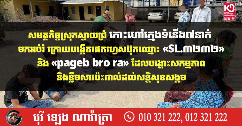 សមត្ថកិច្ចស្រុកស្វាយជ្រំ កោះហៅក្មេងទំនើង៧នាក់ មកអប់រំ ក្រោយបង្កើតផេកហ្វេសប៊ុកឈ្មោះ «SL.៣២៣២» និង «pageb bro ra» ដែលបង្ហោះសកម្មភាព និងខ្លឹមសារប៉ះពាល់ដល់សន្តិសុខសង្គម