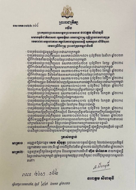 (ភ្នំពេញ)៖ ព្រះករុណា ព្រះបាទសម្ដេច ព្រះមរបនាថ នរោត្តម សីហមុនី ព្រះមហាក្សត្រនៃកម្ពុជា បានចេញព្រះរាជក្រឹត្យ ត្រាស់បង្គាប់អនុញ្ញាតឱ្យលោក សេង ស៊ីវុត្ថា ប្រធានសាលាឧទ្ធរណ៍ភ្នំពេញ ដែលដល់អាយុចូលនិវត្តន៍ បន្តការងាររយៈពេល២ឆ្នាំ ចាប់ពីថ្ងៃទី៥ ខែមីនា ឆ្នាំ២០២៦ ដល់ថ្ងៃទី៥ ខែមីនា ឆ្នាំ២០២៨៕