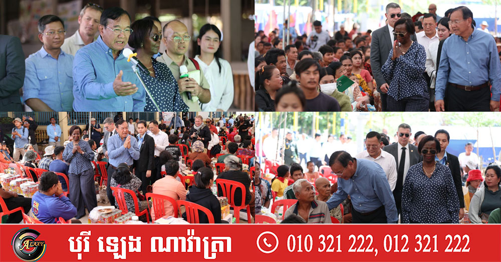 ទស្សនាវីដេអូសកម្មភាព អគ្គលេខាធិការអង្គការហ្វ្រង់កូហ្វូនី និងឧបនាយករដ្ឋមន្ត្រី ប្រាក់ សុខុន ចុះទៅសួរសុខទុក្ខជនភៀសសឹកកម្ពុជា កំពុងស្នាក់នៅក្នុងវត្តសំពៅលូន ស្រុកក្រឡាញ់ ខេត្តសៀមរាប (Video inside)