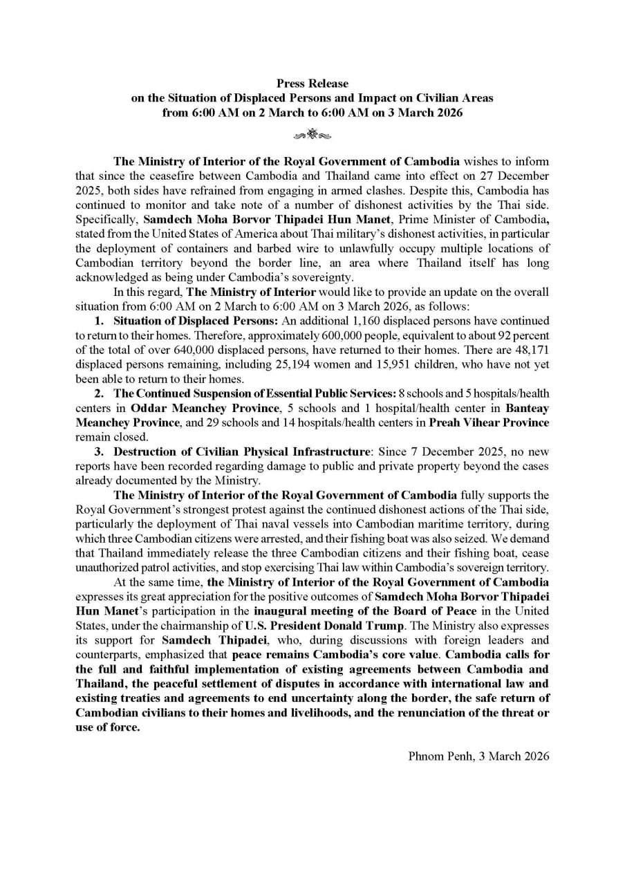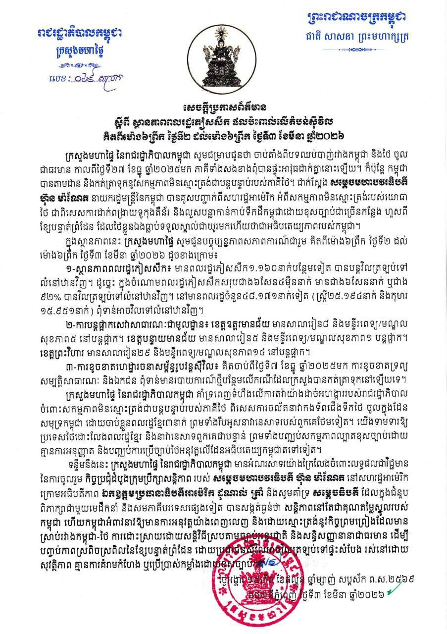 (ភ្នំពេញ)៖ ក្រសួងមហាផ្ទៃ នៅថ្ងៃទី០៣ ខែមីនា ឆ្នាំ២០២៦នេះ បានឲ្យដឹងថា គិតចាប់ពីម៉ោង ៦ព្រឹក ថ្ងៃទី០២ ដល់ម៉ោង៦ព្រឹក ថ្ងៃទី០៣ ខែមីនា ឆ្នាំ២០២៦នេះ មានប្រជាពលរដ្ឋភៀសសឹក ១ ១៦០នាក់បន្ថែមទៀត បានវិលត្រឡប់ទៅលំនៅឋានវិញ។ ដូច្នេះក្នុងចំណោមពលរដ្ឋភៀសសឹកសរុបជាង៦សែន ៤ម៉ឺននាក់ មានជាង ៦សែននាក់ ស្មើនឹងជាង ៩២ភាគរយ បានវិលត្រឡប់ទៅលំនៅឋានវិញ។