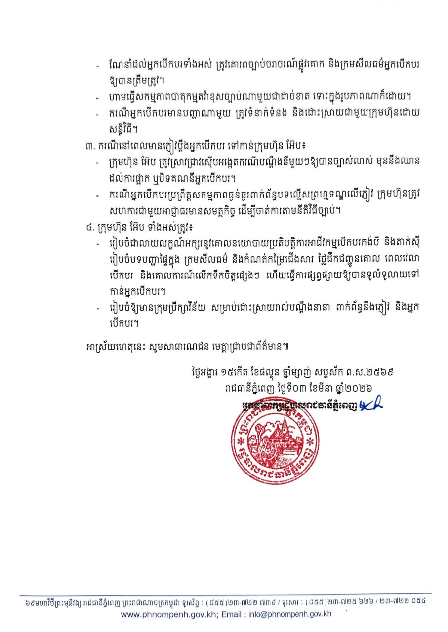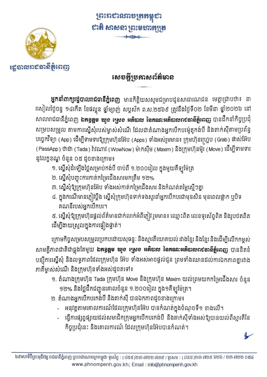 (ភ្នំពេញ)៖ រដ្ឋបាលរាជធានីភ្នំពេញ ចេញសេចក្តីប្រកាសព័ត៌មានជុំវិញប្រជុំសម្របសម្រួល តាមការស្នើសុំរបស់ម្ចាស់សំណើដែលជាតំណាងអ្នកបើកបរម៉ូតូកង់បី និងតាក់ស៊ីតាមប្រព័ន្ធបច្ចេកវិទ្យា (App) ដើម្បីទាមទារឱ្យ ក្រុមហ៊ុនអ៊ែប (Apps) រួមមមាន៖ ក្រុមហ៊ុនហ្គេប (Grab) ផាស់អ៊ែប (PassApp) ថាដា (Tada) វ៉ាវណាវ (WowNow) ម៉ាកស៊ឹម (Maxim) និងក្រុមហ៊ុនអ៊ូរ (Move) ដើម្បីទាមទារនូវលក្ខខណ្ឌថ្មីចំនួន ៥ចំណុច។ កិច្ចប្រជុំនេះធ្វើឡើងនារសៀលថ្ងៃទី០២ ខែមីនា ឆ្នាំ២០២៦ ក្រោមវត្តមានលោក ឃួង ស្រេង អភិបាលរាជធានីភ្នំពេញ។
