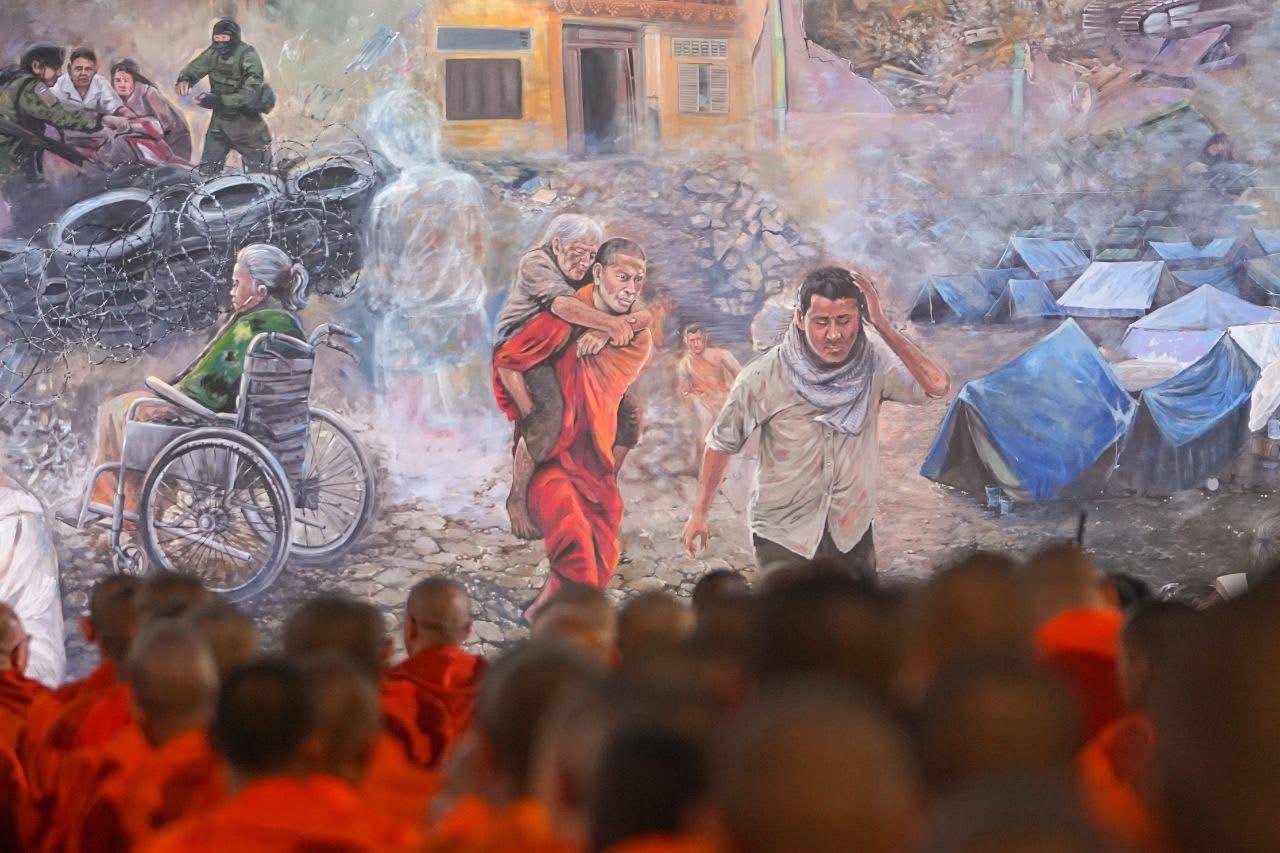 នាឱកាសនោះ លោក ឃួង ស្រេង អភិបាលរាជធានីភ្នំពេញបានថ្លែងអំណរគុណ និងកោតសរសើរដល់វិចិត្រករ និងក្រុមអ្នកស្ម័គ្រចិត្តទាំងអស់ ដែលបានប្រើប្រាស់អស់សមត្ថភាព និងទេពកោសល្យ ដើម្បីគូរផ្ទាំងគំនូប្រកបដោយអត្ថន័យនេះ បង្ហាញឱ្យសហគមន៍ជាតិ និងអន្តរជាតិបានយល់ច្បាស់ពីផលលំបាកដែលបង្កឡើងដោយយោធាថៃ ព្រមទាំងបានបង្ហាញពីការរួបរួម និងសាមគ្គីភាពដ៏រឹងមាំរបស់ប្រជាជនកម្ពុជា។