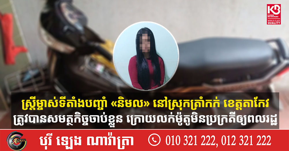 ស្ដ្រីម្ចាស់ទីតាំងបញ្ចាំ «និមល» នៅស្រុកត្រាំកក់ ខេត្តតាកែវ ត្រូវបានសមត្ថកិច្ចចាប់ខ្លួន ក្រោយលក់ម៉ូតូមិនប្រក្រតីឲ្យពលរដ្ឋ