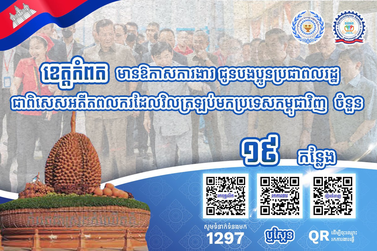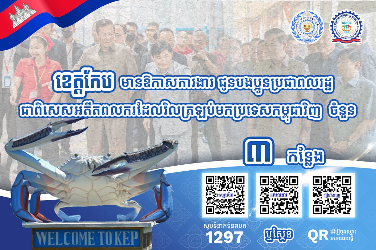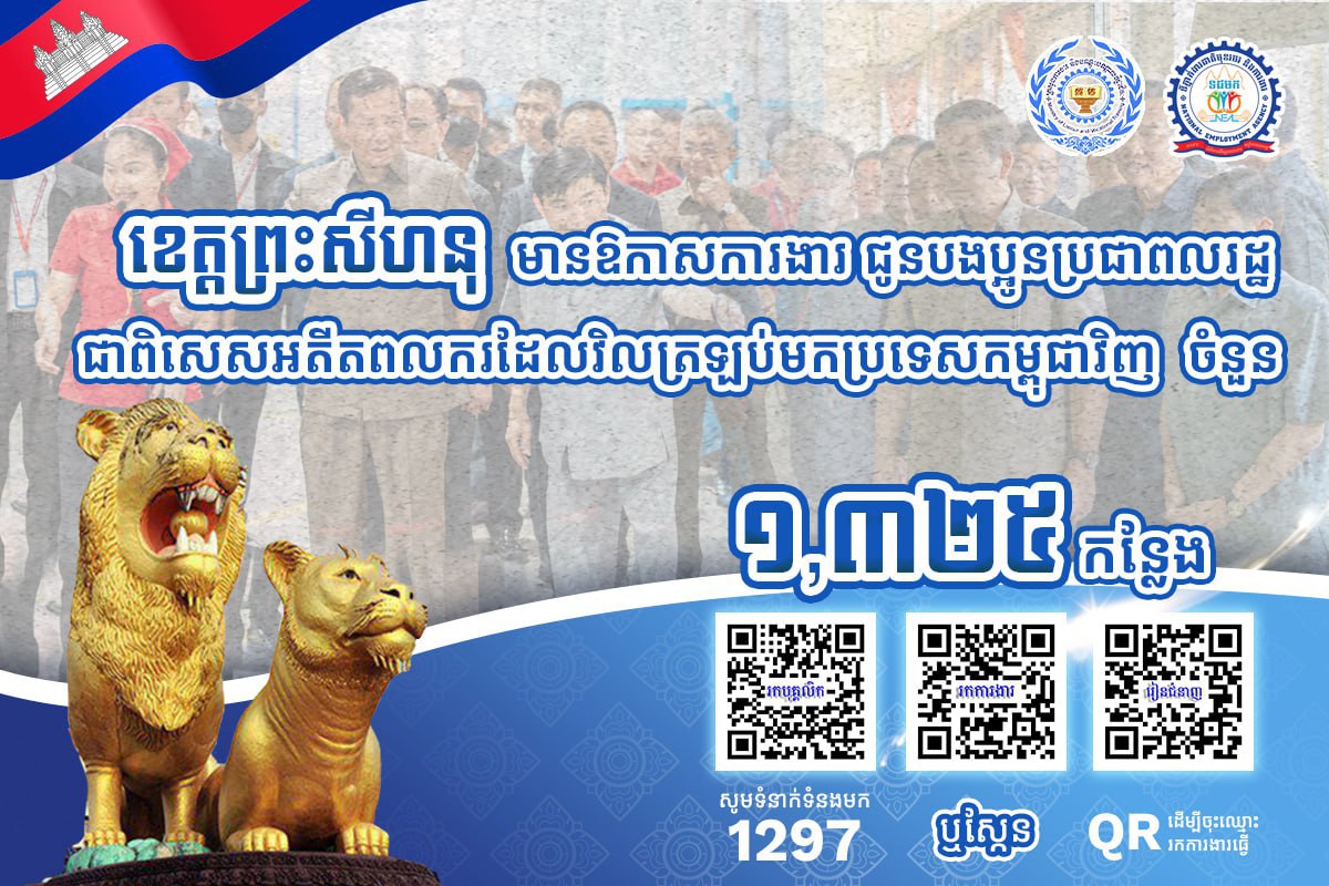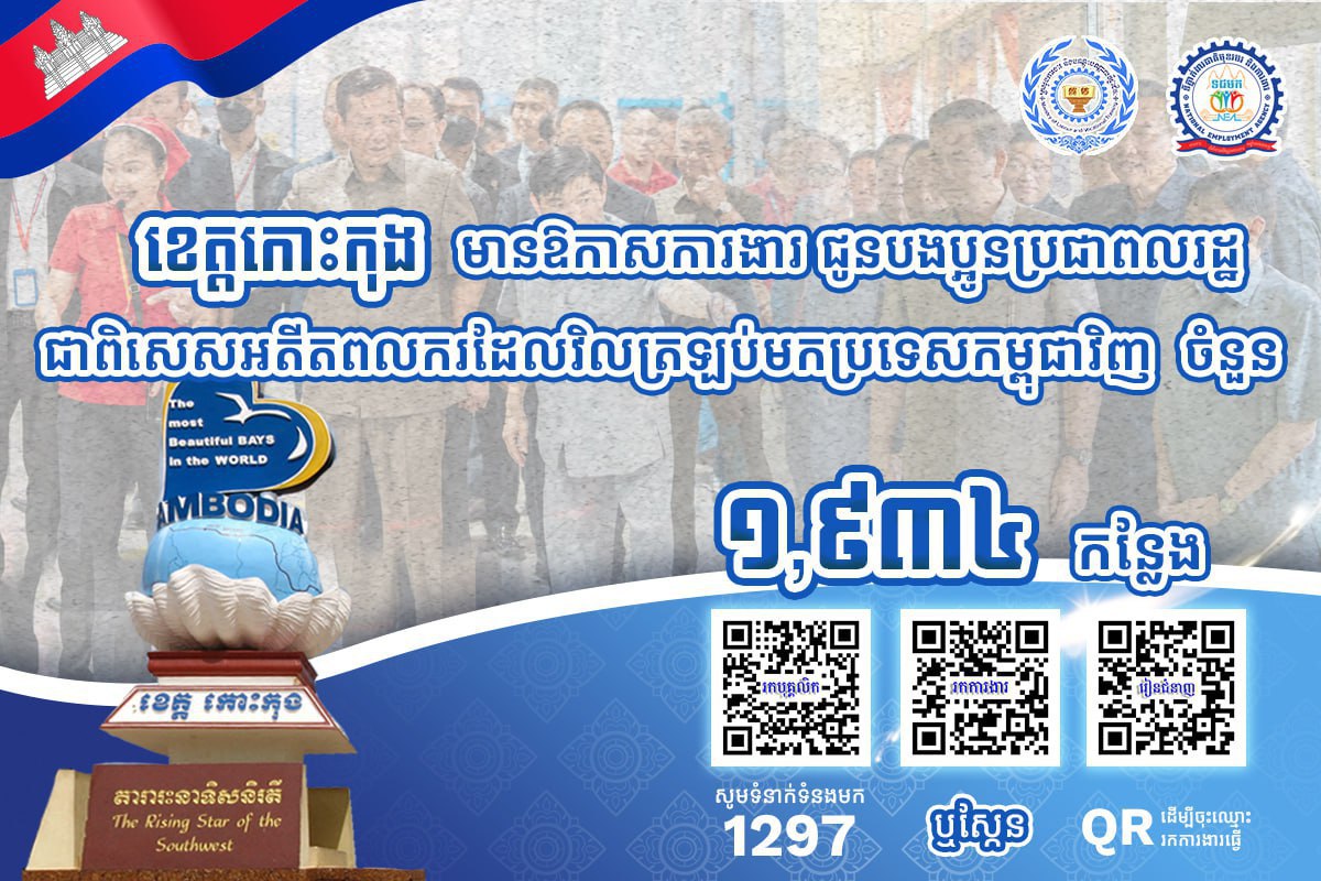 តាមរយៈការផ្សព្វផ្សាយ ក្រសួងការងារបានឱ្យដឹងថា គិតត្រឹមថ្ងៃទី២៧ ខែកុម្ភៈ ឆ្នាំ២០២៦នេះ ខេត្តស្ថិតនៅជាប់សមុទ្ររួមមាន៖ ខេត្តកោះកុង ព្រះសីហនុ កំពត និងខេត្តកែប មានឱកាសការងារសរុបចំនួន ៣,២៨១កន្លែង កំពុងរង់ចាំបងប្អូនអតីតពលករត្រឡប់មកពីប្រទេសថៃ និងអ្នកកំពុងស្វែងរកការងារធ្វើ។ ឱកាសការងារទាំងនោះ ស្ថិតក្នុងវិស័យឧស្សាហកម្ម និងវិស័យសេវាកម្ម។