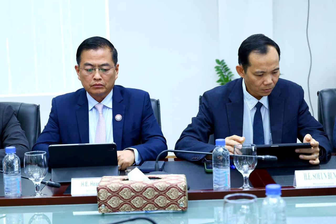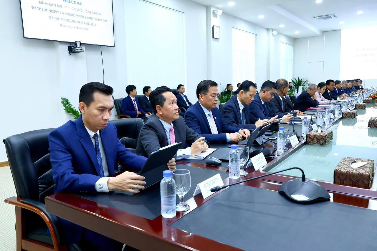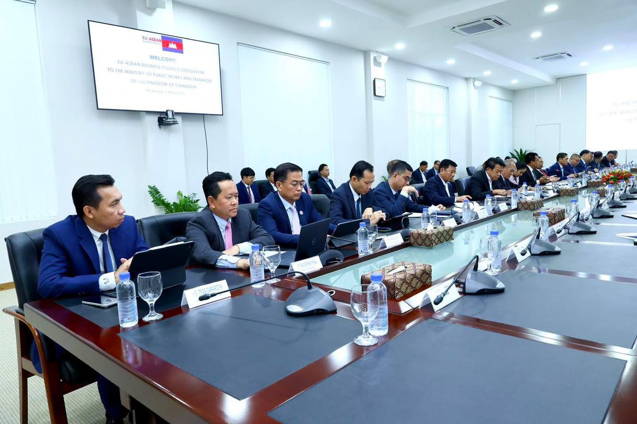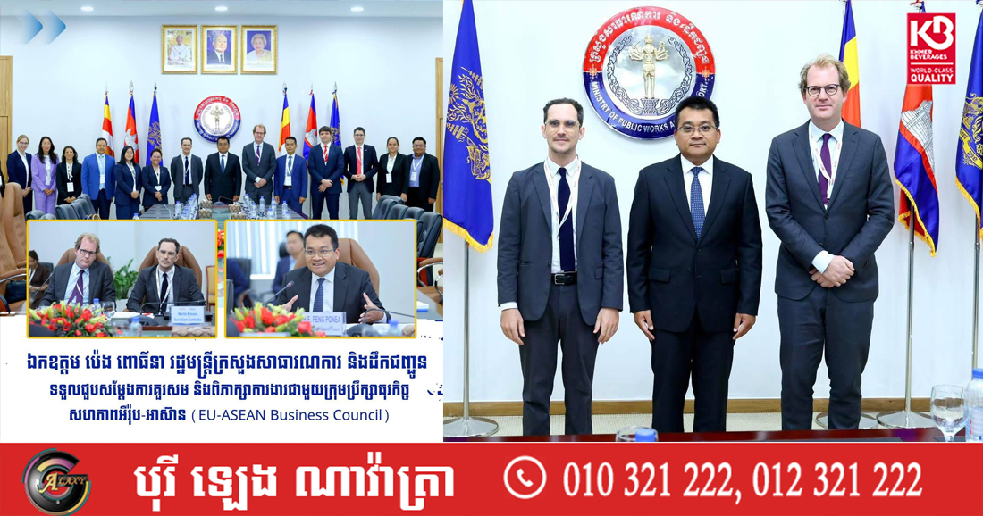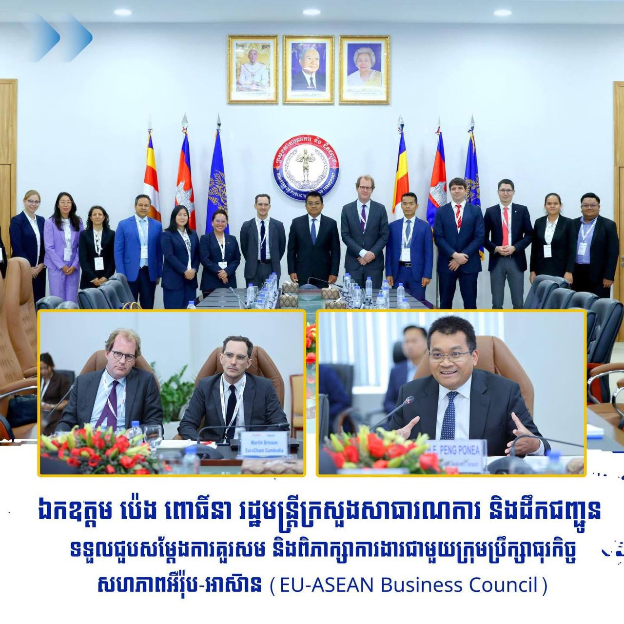 (ភ្នំពេញ )៖ លោក ប៉េង ពោធិ៍នា រដ្ឋមន្រ្តីក្រសួងសាធារណការ និងដឹកជញ្ជូន នារសៀលថ្ងៃទី៤ ខែមីនា ឆ្នាំ២០២៦នេះ បានទទួលជួបសម្តែងការគួរសម និងពិភាក្សាការងារក្រុមប្រឹក្សាធុរកិច្ចសហភាពអឺរ៉ុប-អាស៊ាន (EU-ASEAN Business Council) ដែលដឹកនាំដោយលោក Gustaaf Reerink សមាជិកក្រុមប្រឹក្សាប្រតិបត្តិ នៃសភាពាណិជ្ជកម្មអឺរ៉ុបប្រចាំប្រទេសឥណ្ឌូនេស៊ី (EuroCham Indonesia) និង លោក Martin Brisson នាយកប្រតិបត្តិនៃសភាពាណិជ្ជកម្មអឺរ៉ុបប្រចាំប្រទេសកម្ពុជា (EuroCham Cambodia) ដោយមានការអញ្ជើញចូលរួមពី ថ្នាក់ដឹកនាំក្រសួង និងមន្ត្រីពាក់ព័ន្ធជាច្រើនរូបទៀត។