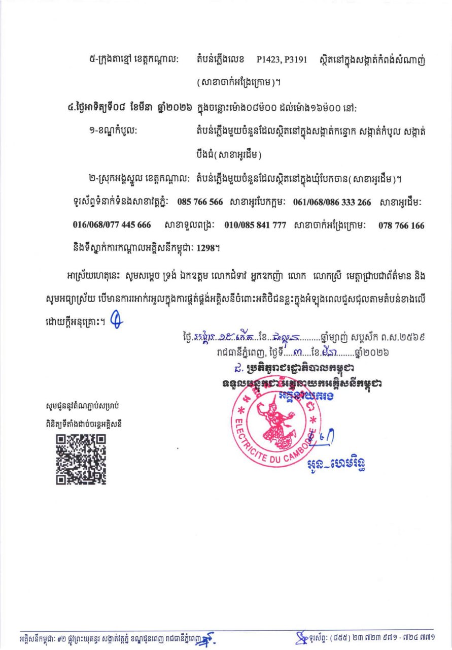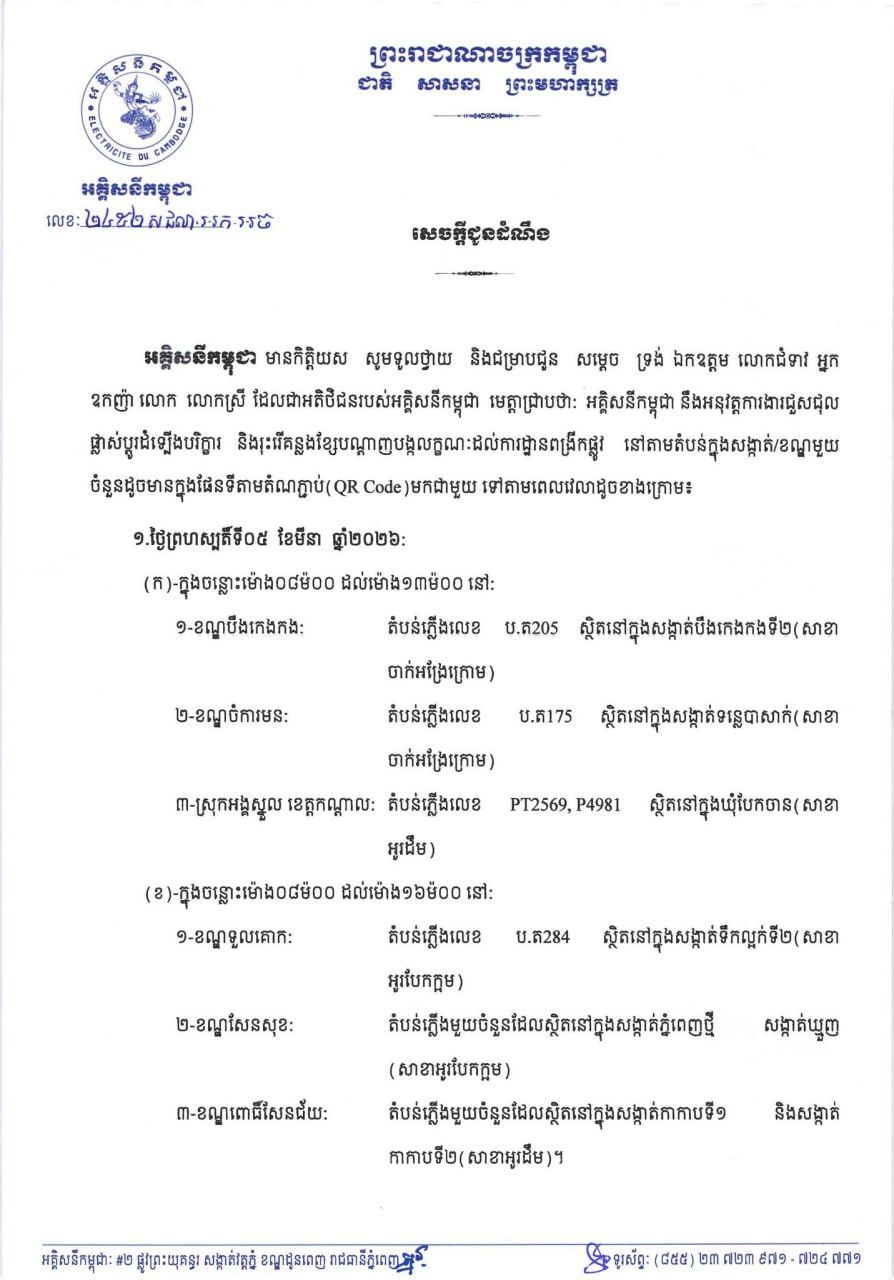 (ភ្នំពេញ)៖ អគ្គិសនីកម្ពុជា (EDC) បានចេញសេចក្តីជូនដំណឹងស្តីពីការអនុវត្តការងារជួសជុល ផ្លាស់ប្តូរដំឡើងបរិក្ខារនានា និងរុះរើគន្លងខ្សែបណ្តាញ អគ្គិសនីរបស់អគ្គិសនីកម្ពុជា ដើម្បីបង្កលក្ខណៈងាយស្រួលដល់ការដ្ឋានពង្រីកផ្លូវ នៅថ្ងៃទី០៥ ខែមីនា ឆ្នាំ២០២៦ ដល់ថ្ងៃទី០៨ ខែមីនា ឆ្នាំ២០២៦ នៅតំបន់មួយចំនួនទៅតាមពេលវេលា និងទីកន្លែងដូចសេចក្តីជូនដំណឹងលម្អិតខាងក្រោម។