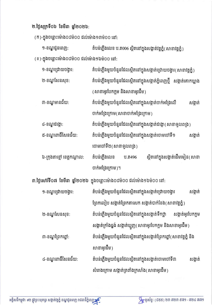 EDC ជូនដំណឹងពីការរអាក់រអួលចរន្តតាមតំបន់សង្កាត់ ខណ្ឌ មួយចំនួនចាប់ពីថ្ងៃនេះដល់ថ្ងៃទី០៨ ខែមីនា ដើម្បីរុះរើគន្លងខ្សែបណ្តាញ ផ្លាស់ប្តូរ តម្លើងបរិក្ខារ ងាយស្រួលដល់ការដ្ឋានពង្រីកផ្លូវ