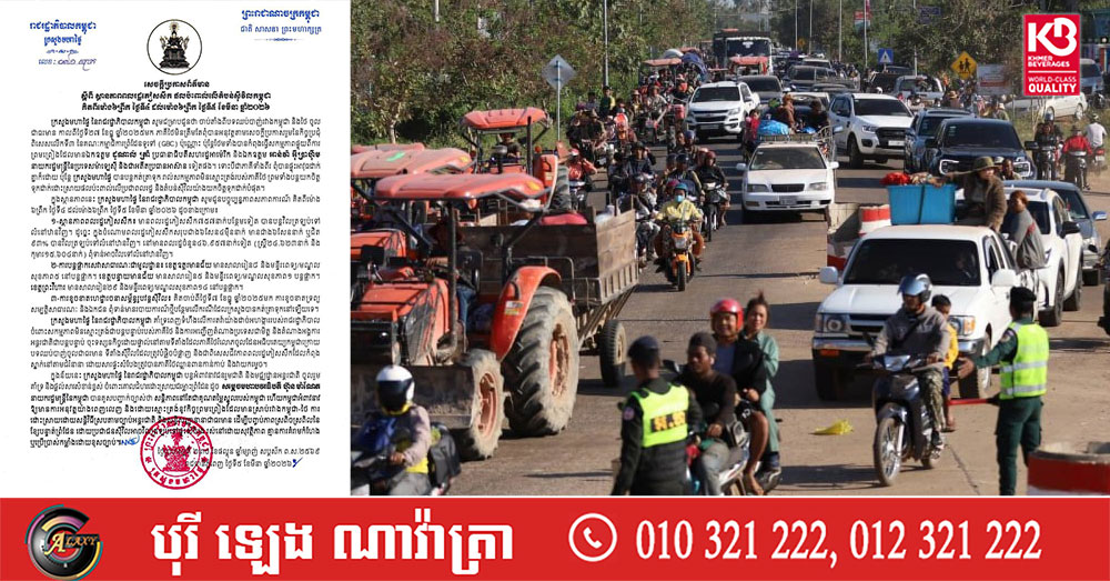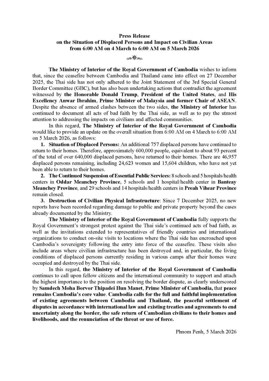 (ភ្នំពេញ)៖ ក្រសួងមហាផ្ទៃ នៅថ្ងៃទី០៥ ខែមីនា ឆ្នាំ២០២៦នេះ បានឲ្យដឹងថា គិតចាប់ពីម៉ោង ៦ព្រឹក ថ្ងៃទី០៤ ដល់ម៉ោង៦ព្រឹក ថ្ងៃទី០៥ ខែមីនា ឆ្នាំ២០២៦នេះ មានប្រជាពលរដ្ឋភៀសសឹក ៧៥៧នាក់បន្ថែមទៀត បានវិលត្រឡប់ទៅលំនៅឋានវិញ។ ដូច្នេះក្នុងចំណោមពលរដ្ឋភៀសសឹកសរុបជាង៦សែន ៤ម៉ឺននាក់ មានជាង ៦សែននាក់ ស្មើនឹងជិត ៩៣ភាគរយ បានវិលត្រឡប់ទៅលំនៅឋានវិញ។