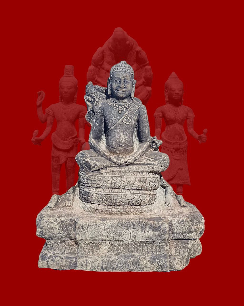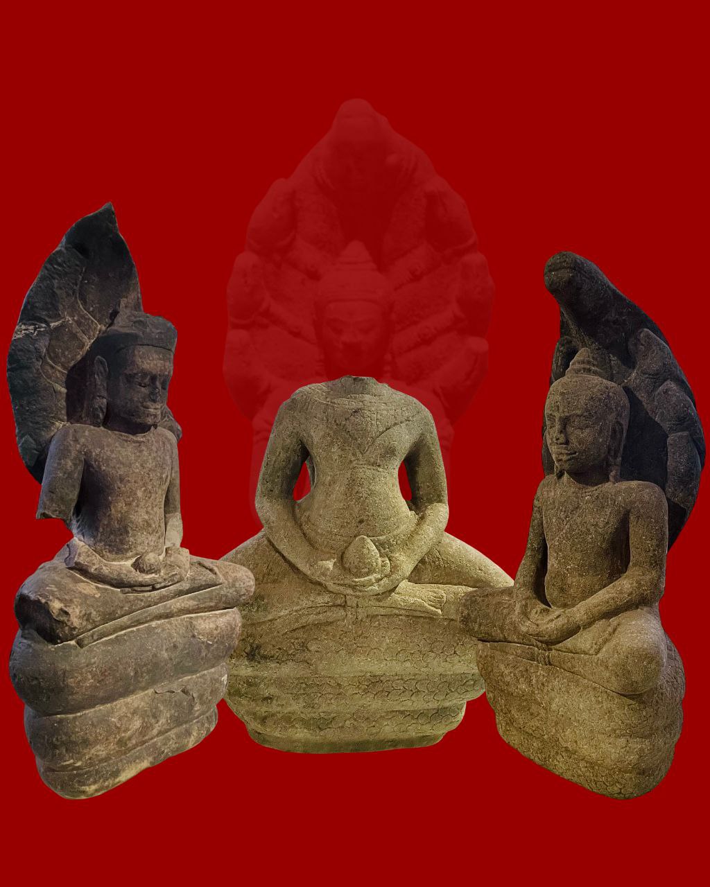 * ទម្រង់ទី៣៖ ចម្លាក់ក្រឡោតខ្ពស់លើផ្ទាំងថ្ម បង្ហាញពីព្រះពុទ្ធគង់ភ្នែនលើបល្ល័ង្កនាគ ដោយមានព្រះលោកេសូរខាងស្តាំ និងព្រះនាងប្រាជ្ញាបារមីនៅខាងឆ្វេង។