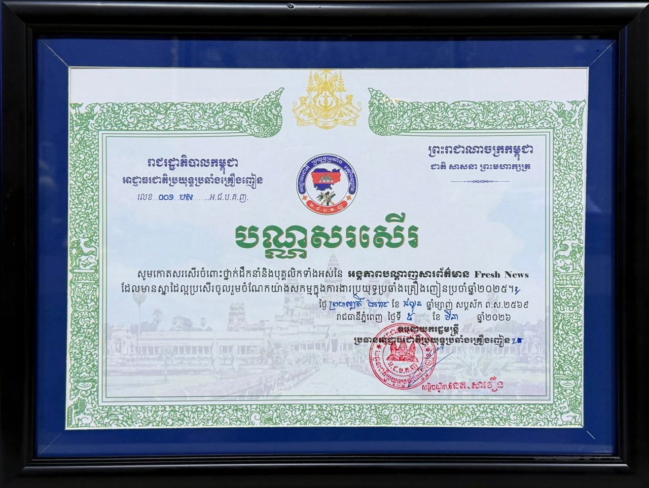 Fresh News បន្តទទួលបណ្ណសរសើរពីអាជ្ញាធរជាតិប្រយុទ្ធប្រឆាំងគ្រឿងញៀន ដែលបានរួមចំណែកយ៉ាងសកម្មជាមួយរាជរដ្ឋាភិបាល ក្នុងការប្រយុទ្ធប្រឆាំងគ្រឿងញៀន (Video inside)
