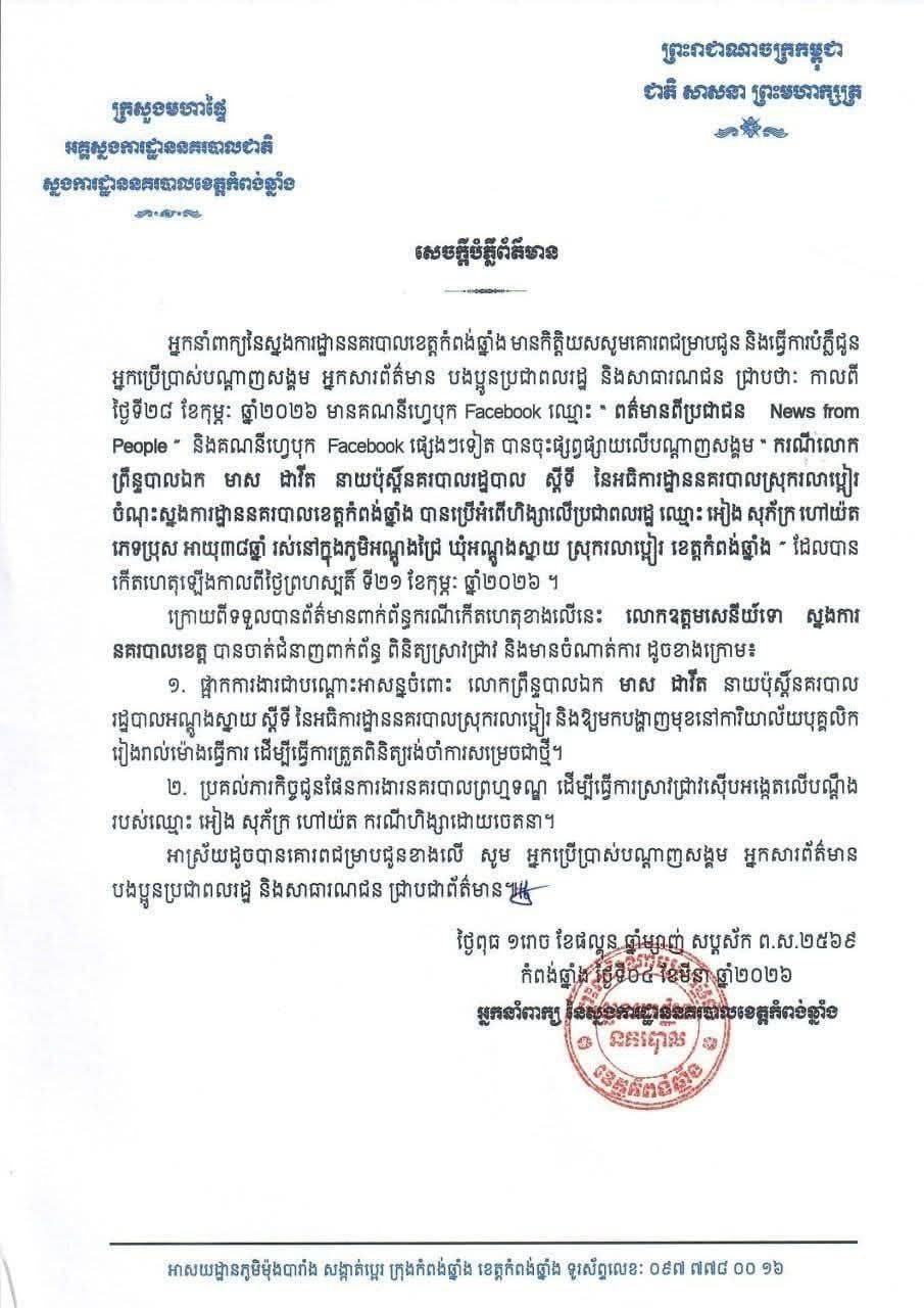 សេចក្តីប្រកាសព័ត៌មានរបស់អ្នកនាំពាក្យ នៃស្នងការដ្ឋានគរបាលខេត្តកំពង់ឆ្នាំង ដែលបណ្តាញព័ត៌មាន Fresh News ទទួលបាននៅថ្ងៃទី៦ ខែមីនា ឆ្នាំ២០២៦ បានឲ្យដឹងថា មានការផ្សព្វផ្សាយតាមបណ្តាញសង្គម ដែលយុវជនម្នាក់បានប្តឹងមន្រ្តីនគរបាល មាស ដាវីត ប្រើហិង្សាលើខ្លួន។