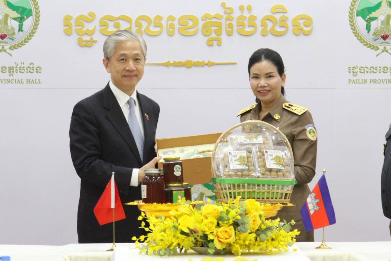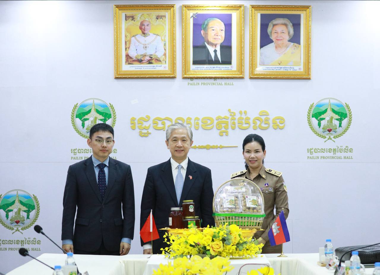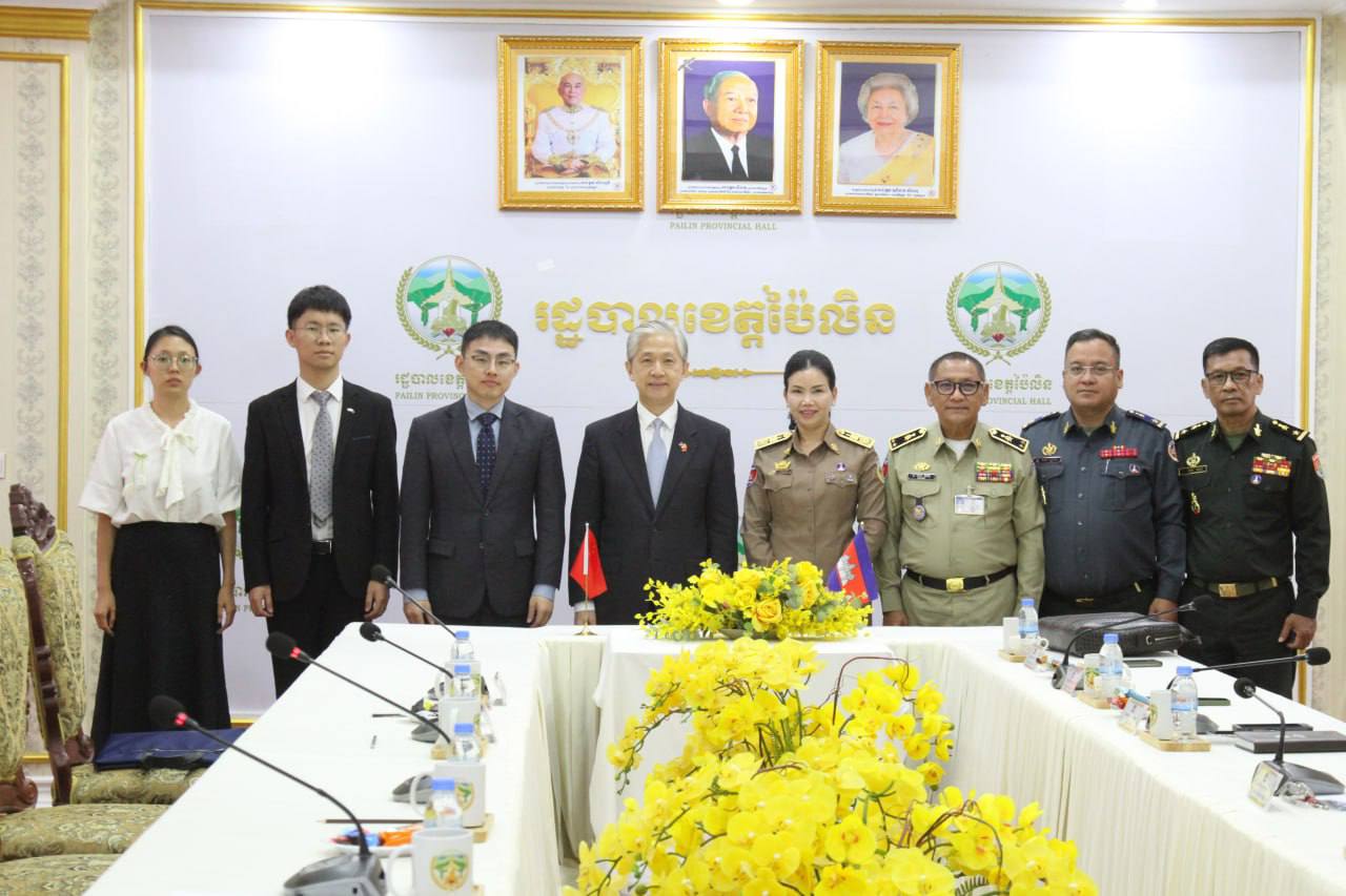 (ប៉ៃលិន)៖ លោកស្រីបណ្ឌិត បាន ស្រីមុំ អភិបាលនៃគណៈអភិបាលខេត្តប៉ៃលិន បានទទួលជួបស្វាគមន៍ និងពិភាក្សាការងារជាមួយលោក វ៉ាង វិនប៊ីន (WANG Wenbin) ឯកអគ្គរដ្ឋទូតសាធារណរដ្ឋប្រជាមានិតចិន ប្រចាំ ព្រះរាជាណាចក្រកម្ពុជា ដើម្បីពិភាក្សា និងសិក្សាឈ្វេងយល់អំពីសក្តានុពលព្រមទាំងស្ថានភាពទូទៅរបស់ខេត្តប៉ៃលិន ក្នុងគោលដៅពង្រឹង និងពង្រីកកិច្ចសហប្រតិបត្តិការឱ្យកាន់តែប្រសើរឡើងរវាងអាជ្ញាធរនៃរដ្ឋបាលខេត្តប៉ៃលិន និងឯកអគ្គរដ្ឋទូត សាធារណរដ្ឋ ប្រជាមានិតចិន ក៏ដូចជាប្រជាជនចិន និងប្រជាជនកម្ពុជាផងដែរ។
