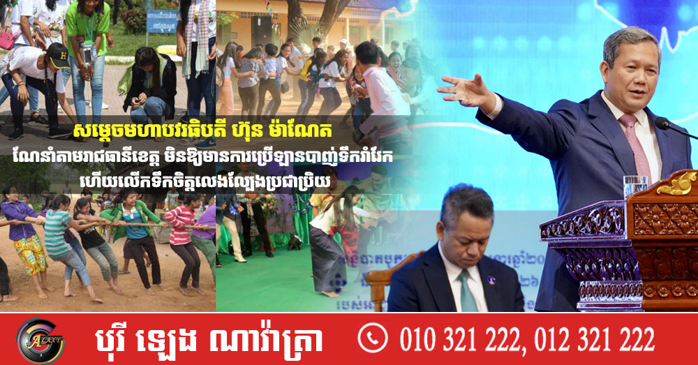 សម្តេចមហាបវរធិបតី ហ៊ុន ម៉ាណែត ណែនាំតាមរាជធានីខេត្ត មិនឱ្យមានការប្រើឡានបាញ់ទឹករាំរែក ហើយលើកទឹកចិត្តលេងល្បែងប្រជាប្រិយ ! (Video inside)