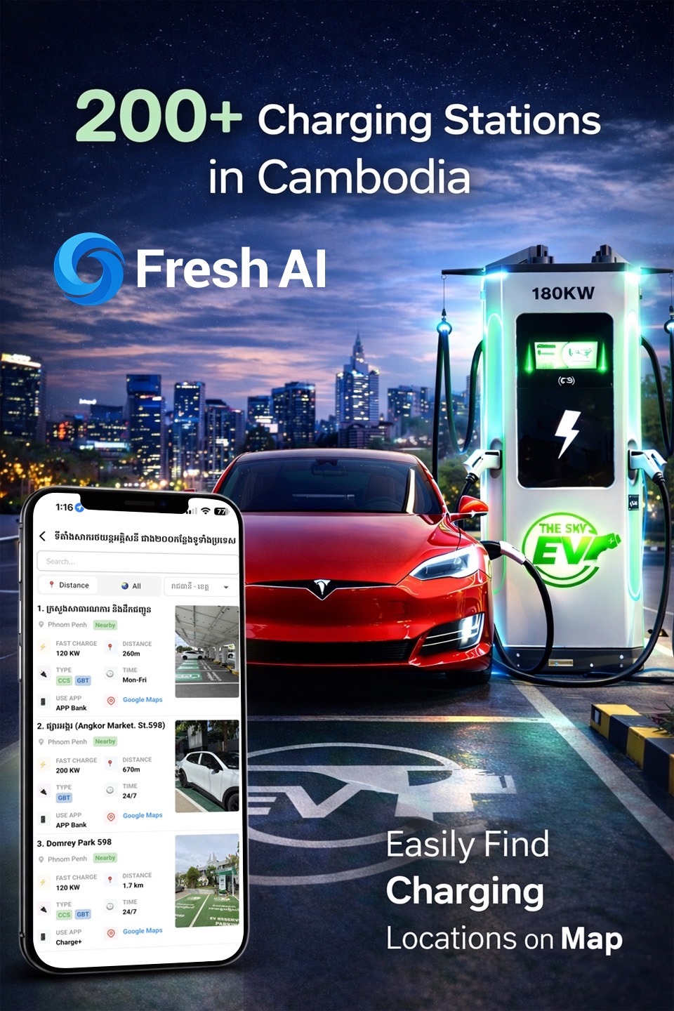 Fresh AI បញ្ចេញមុខងារឆ្លាតវៃ «EV Zone» ស្វែងរកស្ថានីយសាកថ្មរថយន្តអគ្គិសនីជិតបំផុត ជាង២០០ទីតាំងទូទាំងប្រទេស