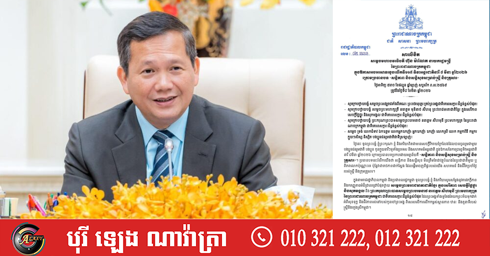សម្តេចមហាបវរធិបតី ហ៊ុន ម៉ាណែត ចេញសារលិខិតអបអរសាទរខួបលើកទី១១៥ ទិវាអន្តរជាតិនារី ៨ មីនា ឆ្នាំ២០២៦ ក្រោមប្រធានបទ «សន្តិភាព និងសន្តិសុខសម្រាប់ស្ត្រី និងគ្រួសារ»