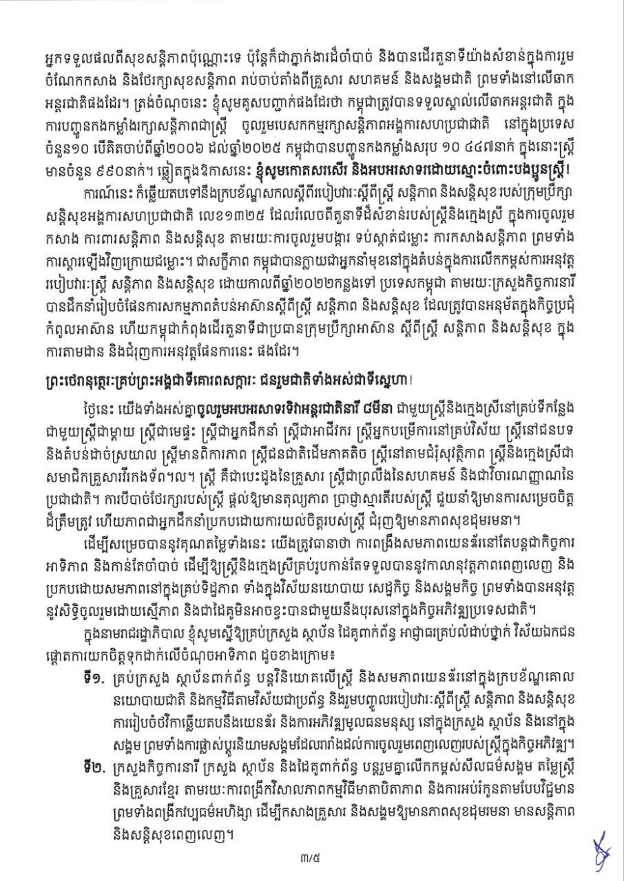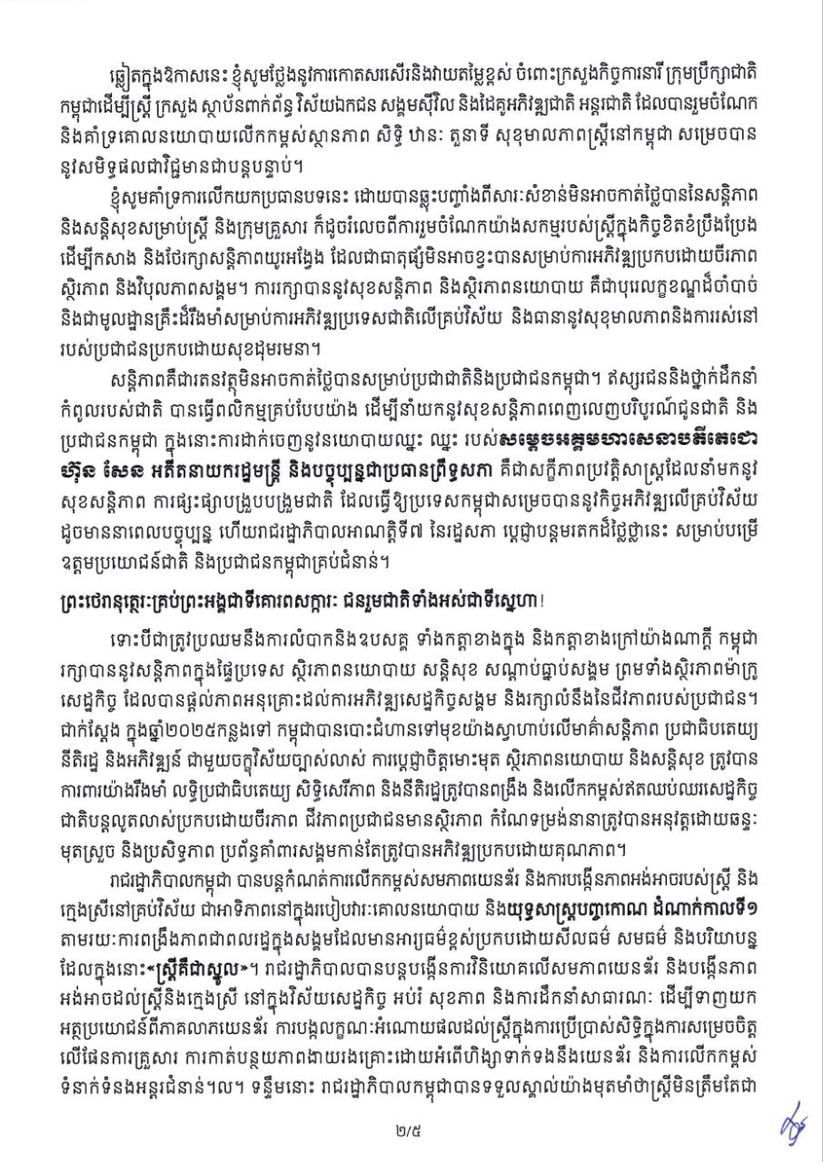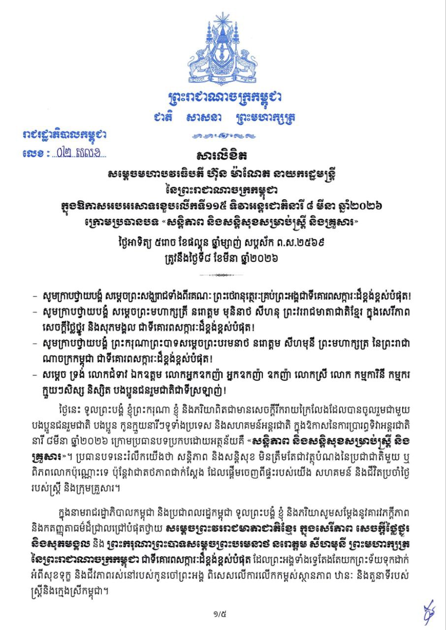 (ភ្នំពេញ)៖ សម្តេចមហាបវរធិបតី ហ៊ុន ម៉ាណែត នាយករដ្ឋមន្ត្រីនៃព្រះរាជាណាចក្រកម្ពុជា បានចេញសារលិខិត ក្នុងឱកាសអបអរសាទរខួបលើកទី១១៥ ទិវាអន្តរជាតិនារី ៨ មីនា ឆ្នាំ២០២៦ ក្រោមប្រធានបទ «សន្តិភាព និងសន្តិសុខសម្រាប់ស្ត្រី និងគ្រួសារ»។