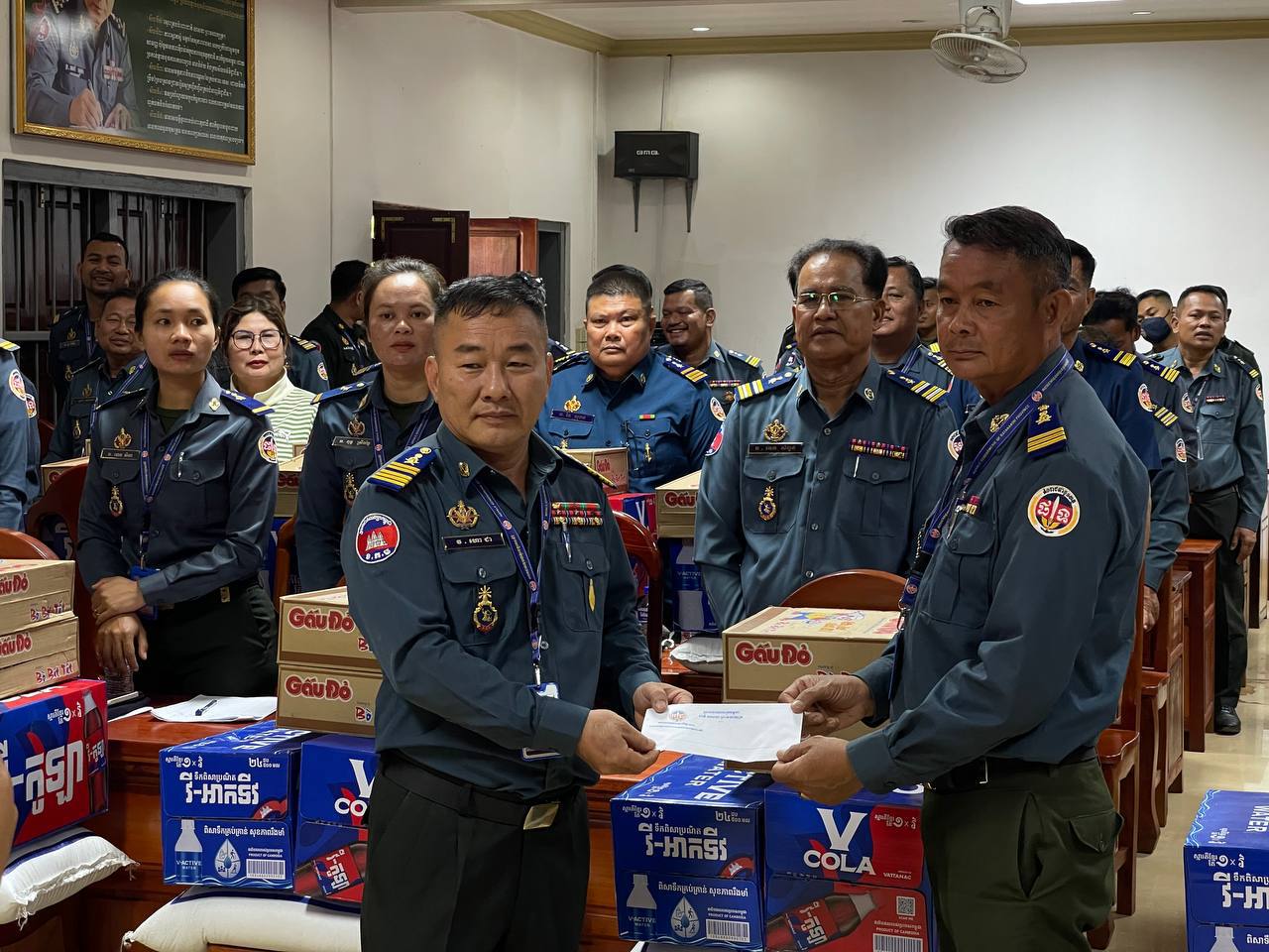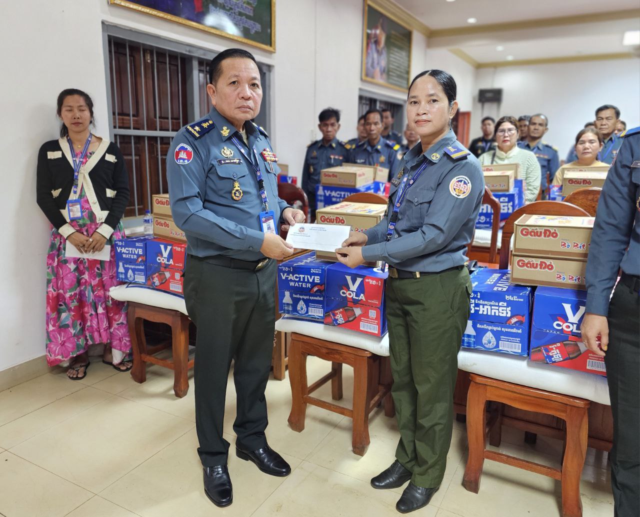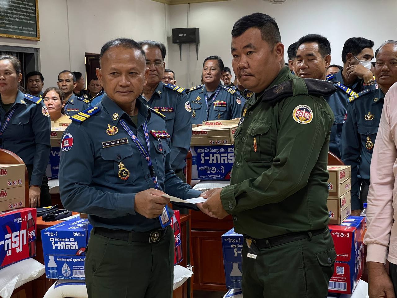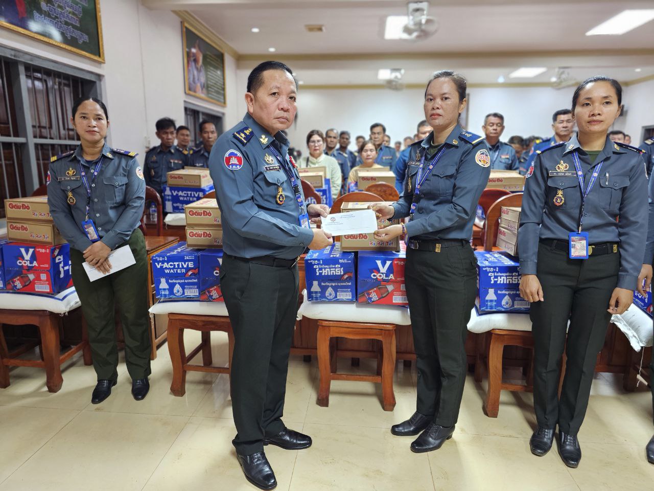 ក្នុងនោះសោធននិវត្តន៍ចំនួន ២០នាក់ គ្រួសារអតីតកងរាជអាវុធហត្ថមរណៈចំនួន ០២គ្រួសារ និងកងរាជអាវុធហត្ថនារីចំនួន ០៥នាក់ ដោយក្នុងម្នាក់ៗទទួលបានអង្ករចំនួន ០១បេ, មី ០២កេស, ទឹកបរិសុទ្ធវីអាក់ទីវចំនួន ០១កេស, ភេសជ្ជៈវីកូឡាចំនួន ០១កេស និងថវិកាចំនួន ១០០ ០០០រៀល។
