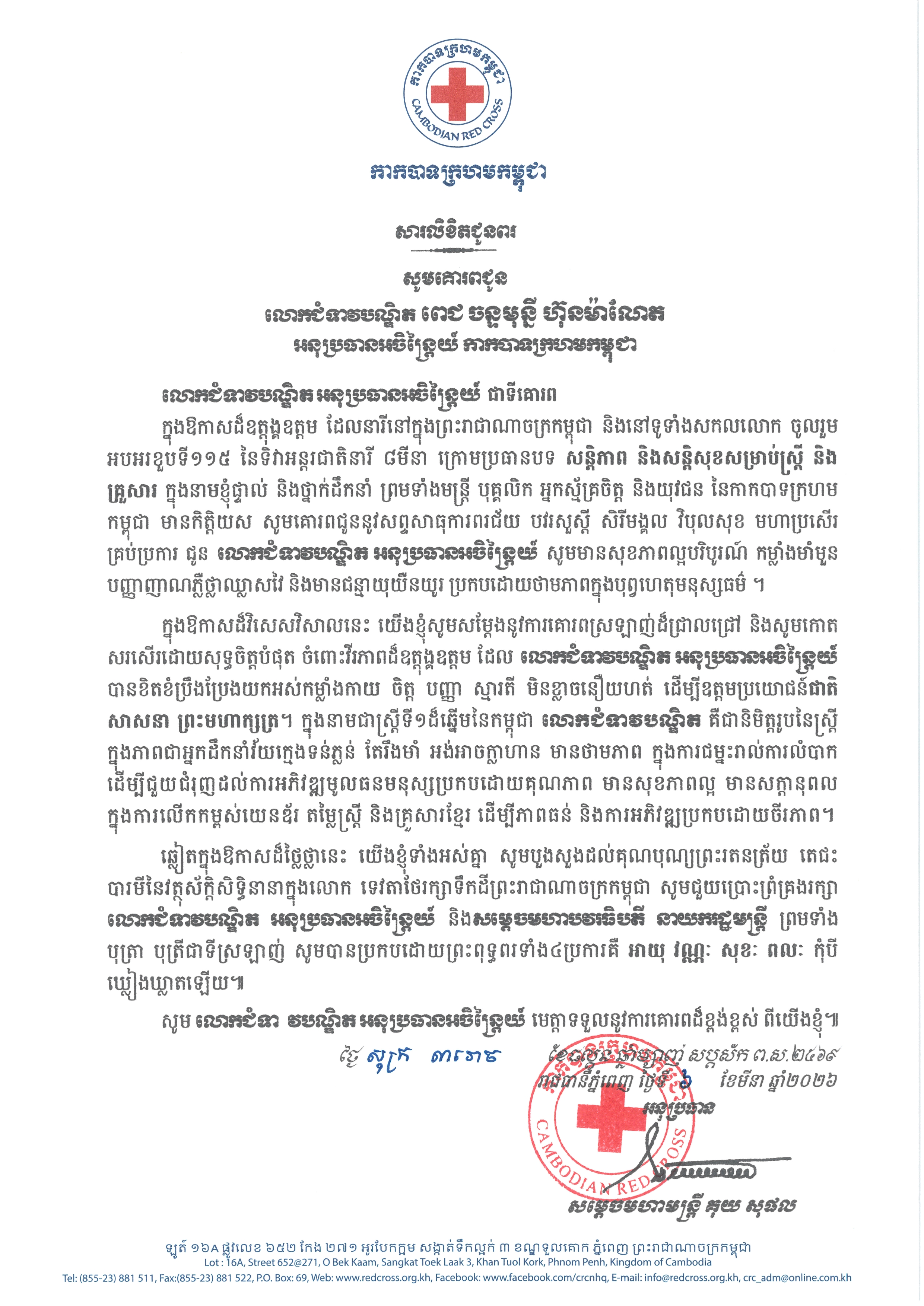 ក្នុងឱកាសដ៏ឧត្តុង្គឧត្តម ដែលនារីនៅក្នុងព្រះរាជាណាចក្រកម្ពុជា និងនៅទូទាំងសកលលោក ចូលរួម អបអរខួបទី១១៥ នៃទិវាអន្តរជាតិនារី ៨មីនា ក្រោមប្រធានបទ សន្តិភាព និងសន្តិសុខសម្រាប់ស្ត្រី និង គ្រួសារ ក្នុងនាមខ្ញុំផ្ទាល់ និងថ្នាក់ដឹកនាំ ព្រមទាំងមន្ត្រី បុគ្គលិក អ្នកស្ម័គ្រចិត្ត និងយុវជន នៃកាកបាទក្រហម កម្ពុជា មានកិត្តិយស សូមគោរពជូននូវសព្ទសាធុការពរជ័យ បវរសួស្តី សិរីមង្គល វិបុលសុខ មហាប្រសើរ គ្រប់ប្រការ ជូន លោកជំទាវបណ្ឌិត អនុប្រធានអចិន្ត្រៃយ៍ សូមមានសុខភាពល្អបរិបូរណ៍ កម្លាំងមាំមួន បញ្ញាញាណភ្លឺថ្លាឈ្លាសវៃ និងមានជន្មាយុយឺនយូរ ប្រកបដោយថាមភាពក្នុងបុព្វហេតុមនុស្សធម៌ ។