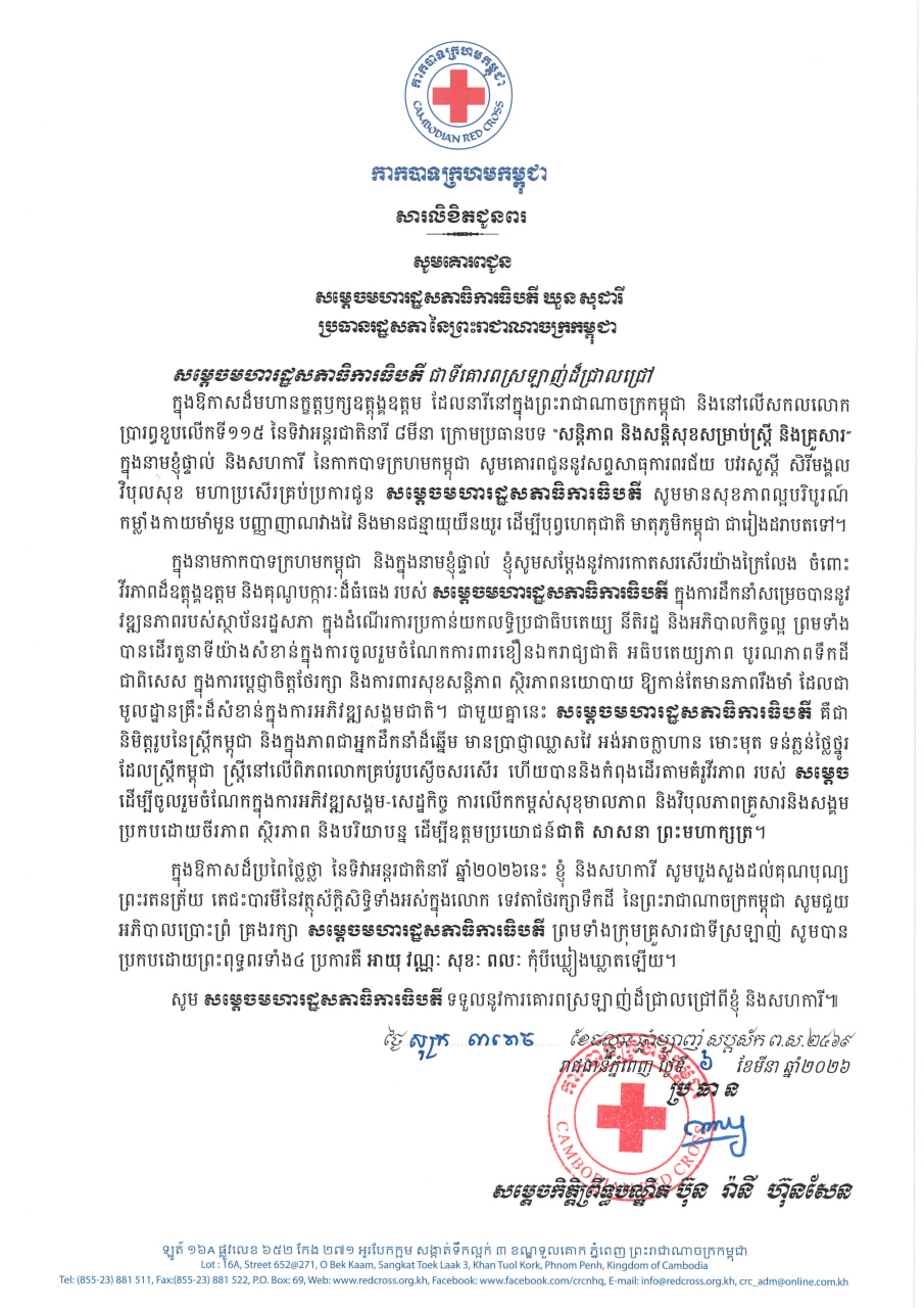 ជាងនេះទៅទៀត ក្នុងឱកាសដ៏ប្រពៃថ្លៃថ្លា នៃទិវាអន្តរជាតិនារី ឆ្នាំ២០២៦នេះ ខ្ញុំ និងសហការី សូមបួងសួងដល់គុណបុណ្យ ព្រះរតនត្រ័យ តេជះបារមីនៃវត្ថុស័ក្តិសិទ្ធិទាំងអស់ក្នុងលោក ទេវតាថែរក្សាទឹកដី នៃព្រះរាជាណាចក្រកម្ពុជា សូមជួយ អភិបាលប្រោះព្រំ គ្រងរក្សា សម្តេចមហារដ្ឋសភាធិការធិបតី ព្រមទាំងក្រុមគ្រួសារជាទីស្រឡាញ់ សូមបាន ប្រកបដោយព្រះពុទ្ធពរទាំង៤ ប្រការគឺ អាយុ វណ្ណៈ សុខៈ ពលៈ កុំបីឃ្លៀងឃ្លាតឡើយ។ សូមសម្តេចមហារដ្ឋសភាធិការធិបតី ទទួលនូវការគោរពស្រឡាញ់ដ៏ជ្រាលជ្រៅពីខ្ញុំ និងសហការី»៕