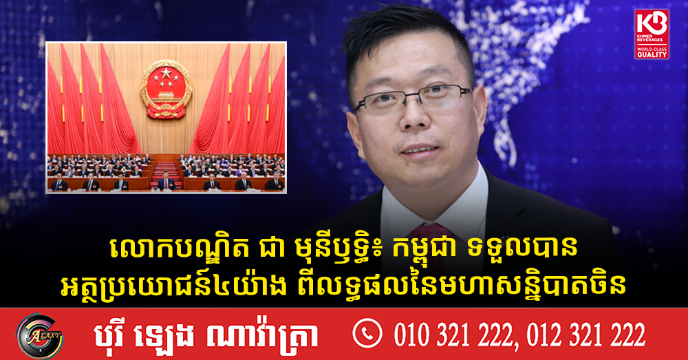 (ភ្នំពេញ)៖ លោកបណ្ឌិត ជា មុនីឫទ្ធិ ប្រធានសមាគមអ្នកស្រាវជ្រាវវឌ្ឍនភាពកម្ពុជា-ចិន បានបង្ហាញឲ្យឃើញថា កម្ពុជា អាចទទួលបានអត្ថប្រយោជន៍៤យ៉ាង ពីលទ្ធផលនៃមហាសន្និបាតលើកទី៤ នៃសភាតំណាងប្រជាជនទូទាំងប្រទេសចិន នីតិកាលទី១៤ នៅខែមីនា ឆ្នាំ២០២៦នេះ។ នេះបើតាមការបញ្ជាក់ពីលោកបណ្ឌិតមកកាន់បណ្ដាញព័ត៌មាន Fresh News។
